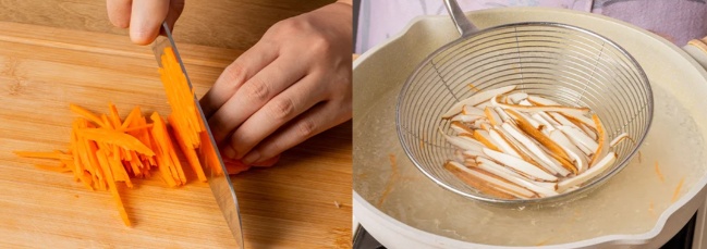 3.将黄瓜、胡萝卜、豆干、火腿分别切成细丝,把处理好的食材焯水备用。