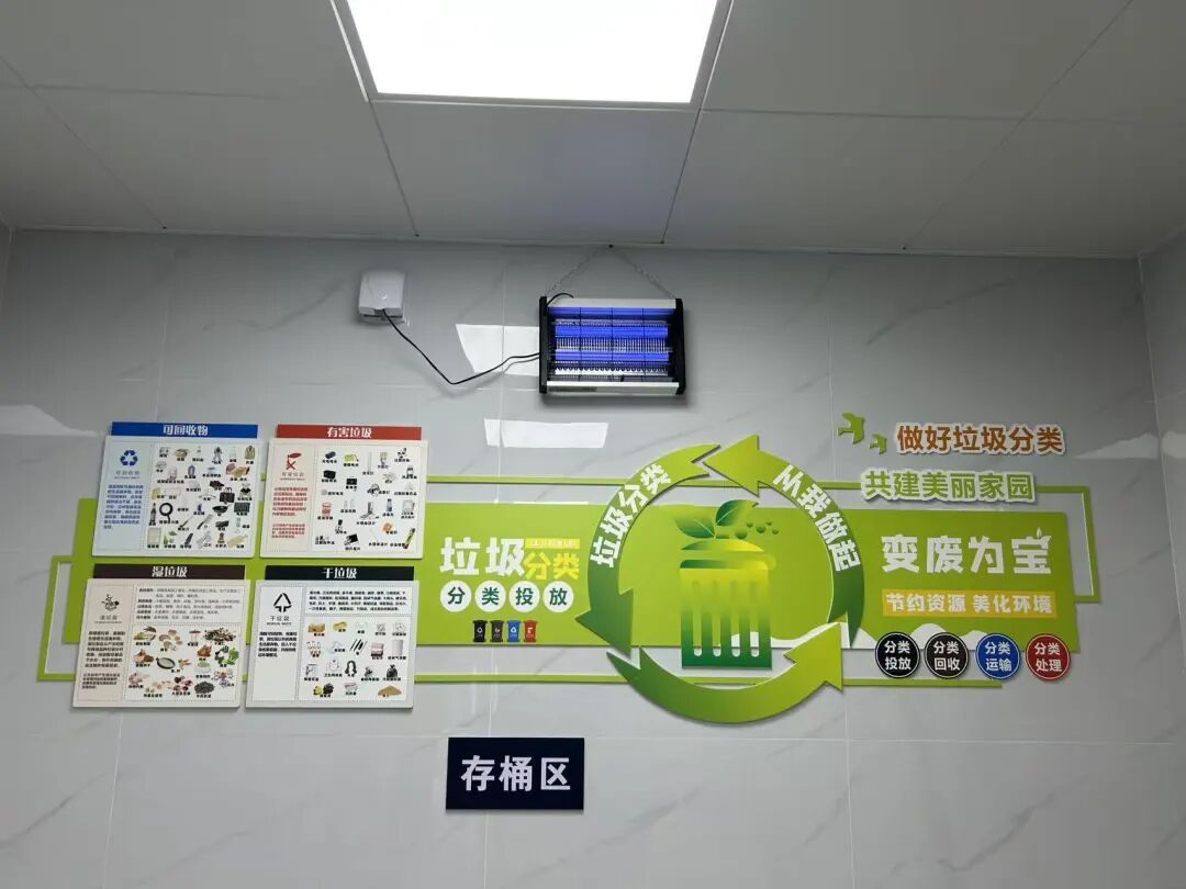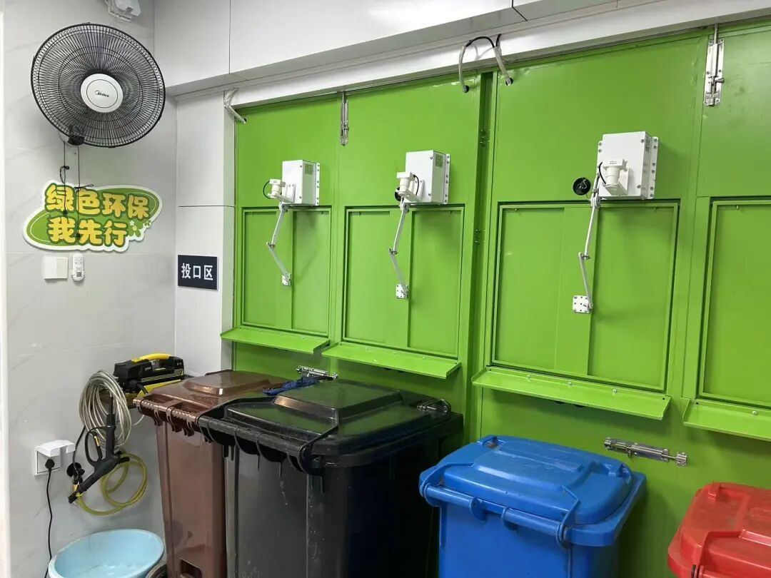 垃圾箱房内,灭虫、除臭、节能照明装置、排风扇等设备一应俱全。二十平方米左右的空间可以同时容纳十几个四分类垃圾桶,专门设置的工具间则方便保洁人员开展清洁维护工作。