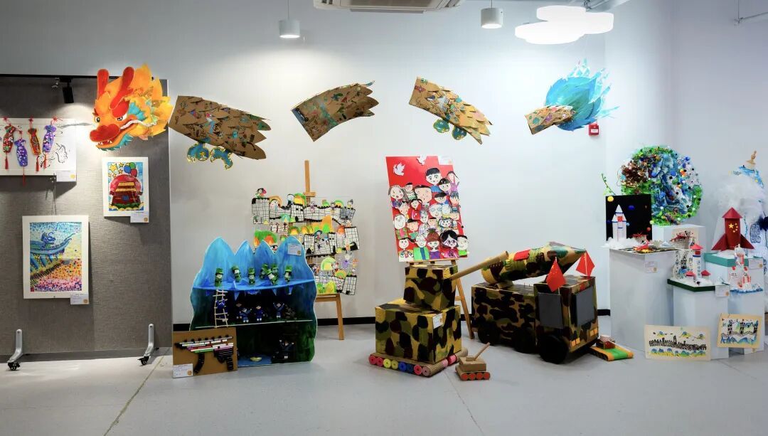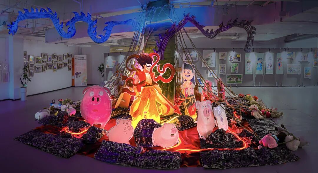 作为活动核心,《艺塑绘梦·同创凌云》艺术展聚焦“废弃物再生”与“代际共创”,汇聚了社区多元群体的环保艺术作品。大型装置《深海龙柱》以国漫《哪吒之魔童闹海》为灵感,巧妙利用展厅立柱构建神话场景。回收纸板、雪弗板经立体塑形,呈现出青铜质感;废弃雪弗板雕刻出敖光、敖丙父子龙神形象;水管与纸板组合成蜿蜒龙身;孩子们闲置的玩具被重新组合,成为锁链镇海妖的意象;废旧报纸、纸板与低碳LED灯则共同营造出炽热岩浆地表……一件件“废弃材料”在此焕发新的艺术生命力。