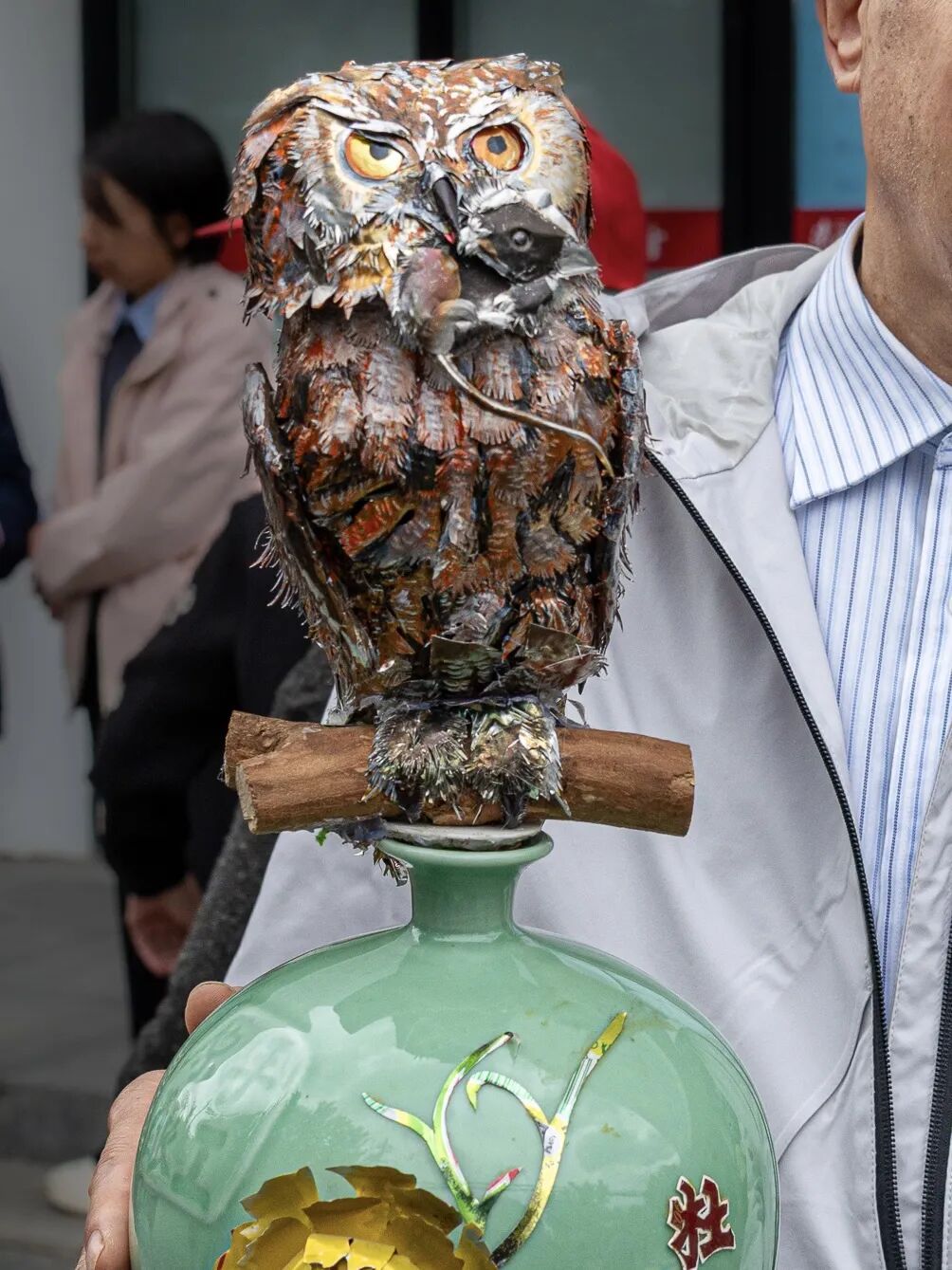 启幕仪式上,一系列精彩表演轮番上演。陇龙幼稚园孩子们带来活力四射的开场舞,点燃现场气氛。生态凌云“守艺人”志愿服务队分组亮相:编织组与丝网花组巧手制作各式花卉,装点美好生活;布艺组则展示了以布料创作的首饰与牡丹图,巧妙融入海派文化元素,让环保艺术更具内涵;易拉罐组的爷叔们带来用废弃易拉罐制作的龙、穿山甲、猫头鹰等摆件,部分作品还装备机械装置,点头摆尾,栩栩如生。