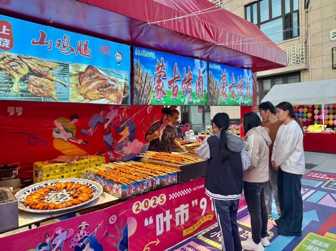 走进“叶市”现场,长达百米的集市长廊人群熙攘,吆喝声、欢笑声此起彼伏,烟火气十足。作为集市的核心吸引力,以各地特色小吃为主打的美食摊位紧密相连,炭火与灯光的交织下,蒙古烤肉串在烤架上翻滚,油脂滋滋滴落,香气扑鼻。特色长沙臭豆腐则在油锅中上下翻腾,外皮焦香,鲜辣开胃。此外,三鲜豆皮、武汉热干面、天津狗不理包子等各色小吃一应俱全,引得食客接踵而至。