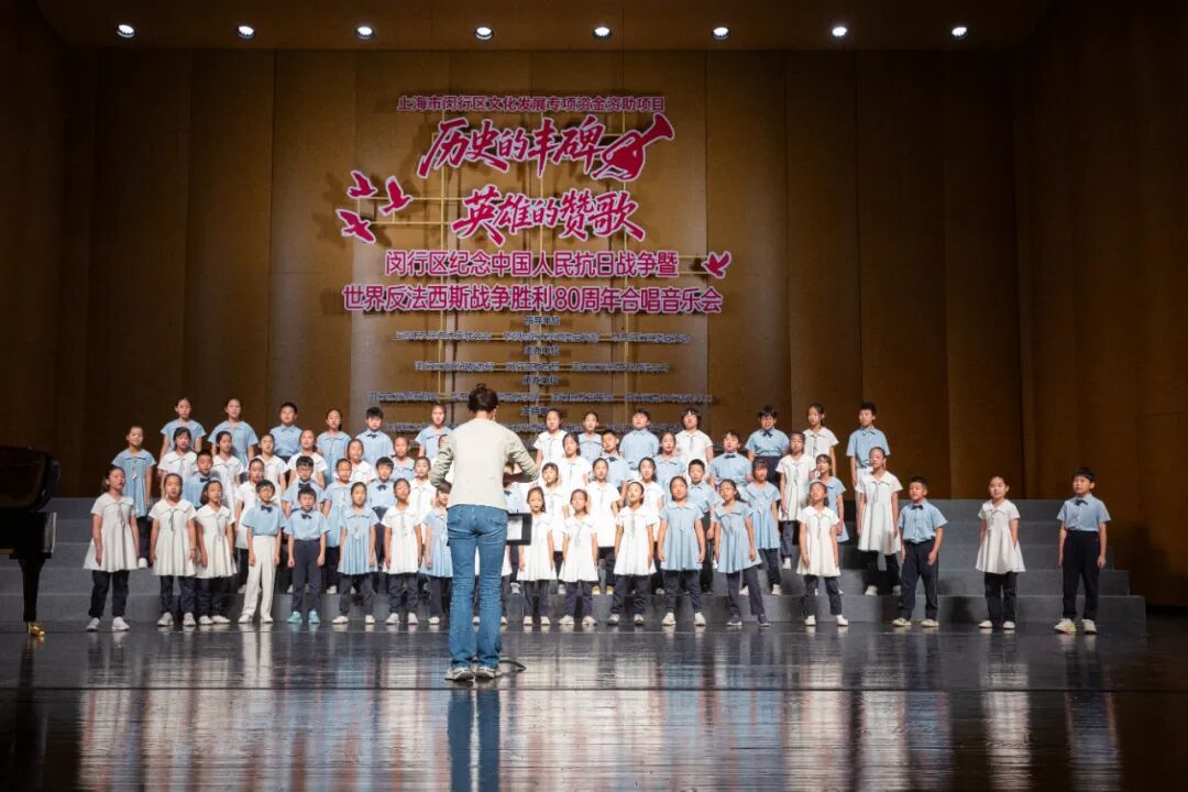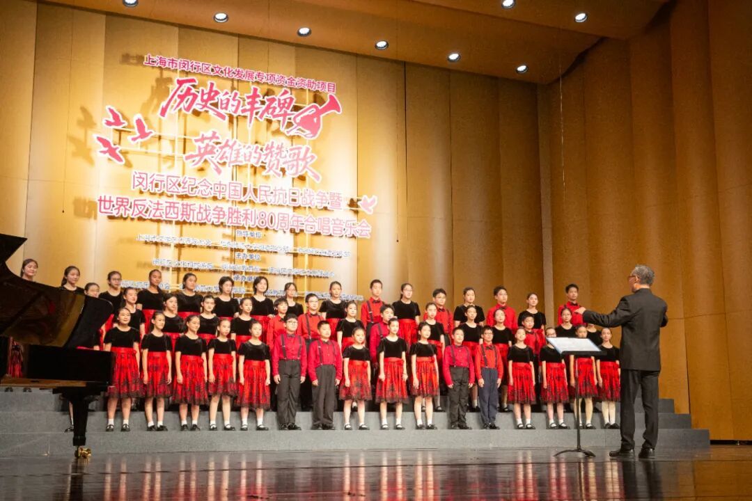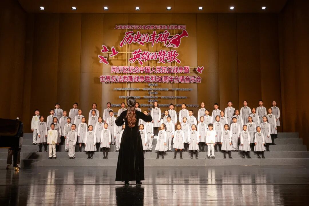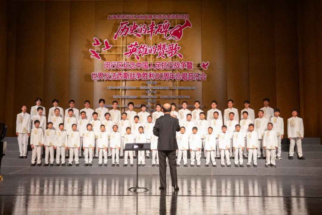音乐会在《在太行山上》《黄水谣》等经典抗战歌曲的混声合唱中拉开序幕,闵行爱乐合唱团与闵行男童合唱团的深情演绎,瞬间将观众带回那段山河不屈的岁月。随后,闵行区实验小学蒙正童声合唱团带来的《卖报歌》,以纯真童声诉说了战火中的童年,令人动容。