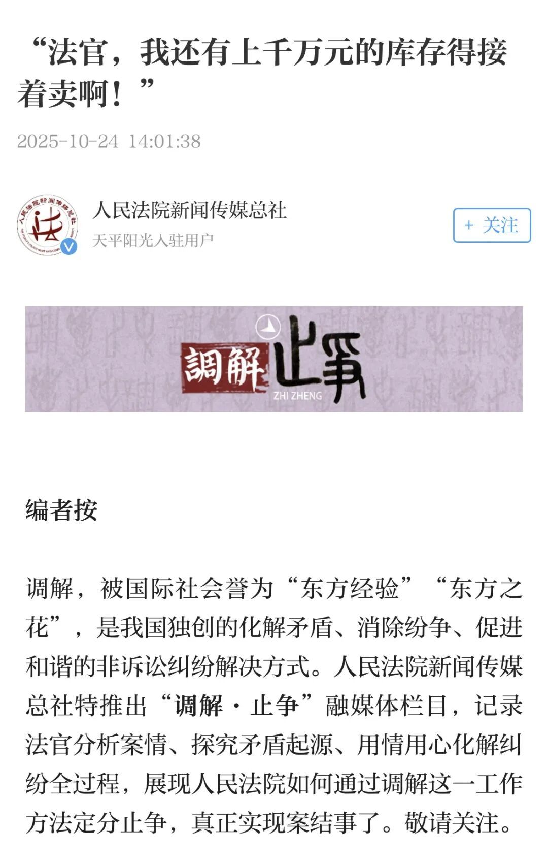 调解,被国际社会誉为“东方经验”“东方之花”,是我国独创的化解矛盾、消除纷争、促进和谐的非诉讼纠纷解决方式。人民法院新闻传媒总社特推出“调解·止争”融媒体栏目,记录法官分析案情、探究矛盾起源、用情用心化解纠纷全过程,展现人民法院如何通过调解这一工作方法定分止争,真正实现案结事了。敬请关注。