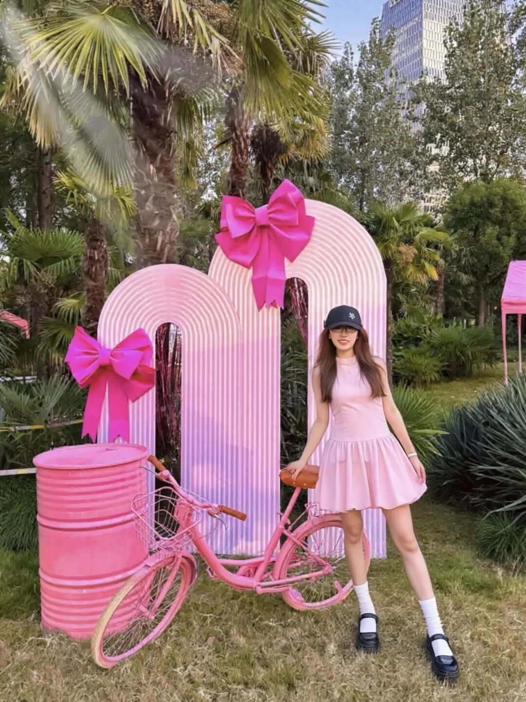 一走进新虹桥中心花园,阳光、草地与充满粉色浪漫的Barbie元素交织,俨然一个芭比主题梦幻乐园。不仅有各色梦幻粉打卡装置,每个市集摊位的门头也装上了“超大号”粉色蝴蝶结,激起了谁的少女心~