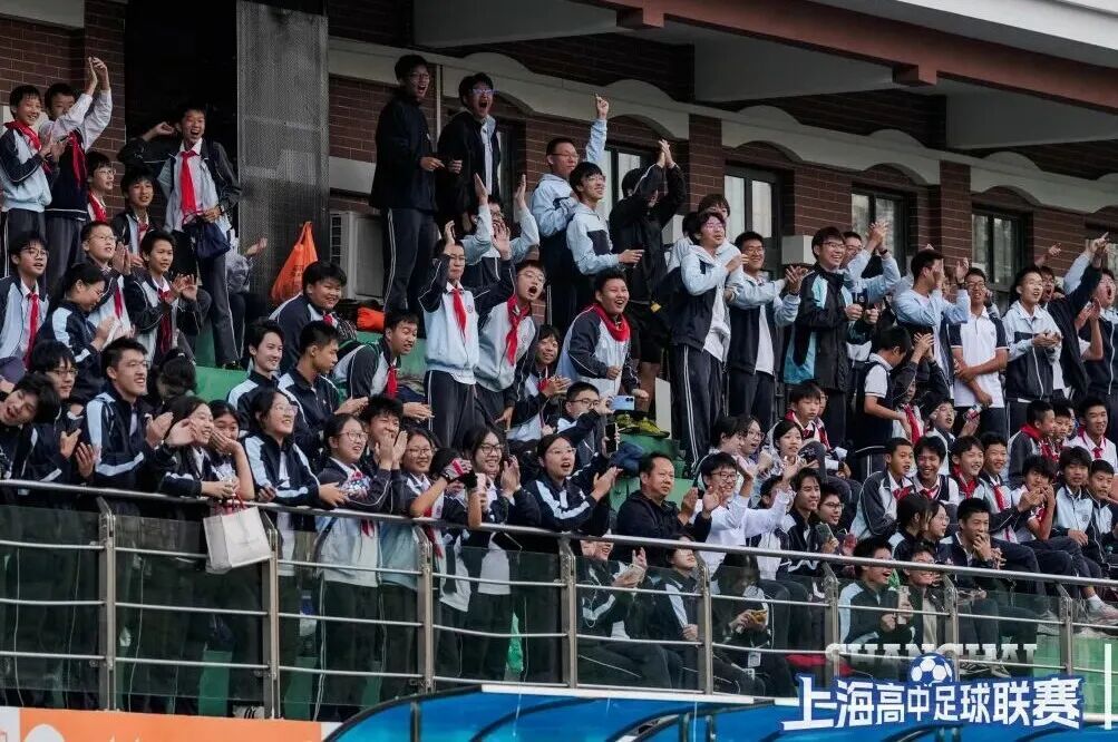 看台上,向阳小学、田林四小的小朋友们与南洋中学本校学生组成的助威团呐喊声阵阵,为这场比赛注入热烈氛围,最终南洋中学凭借出色发挥,以4:0的悬殊比分斩获主场胜利。