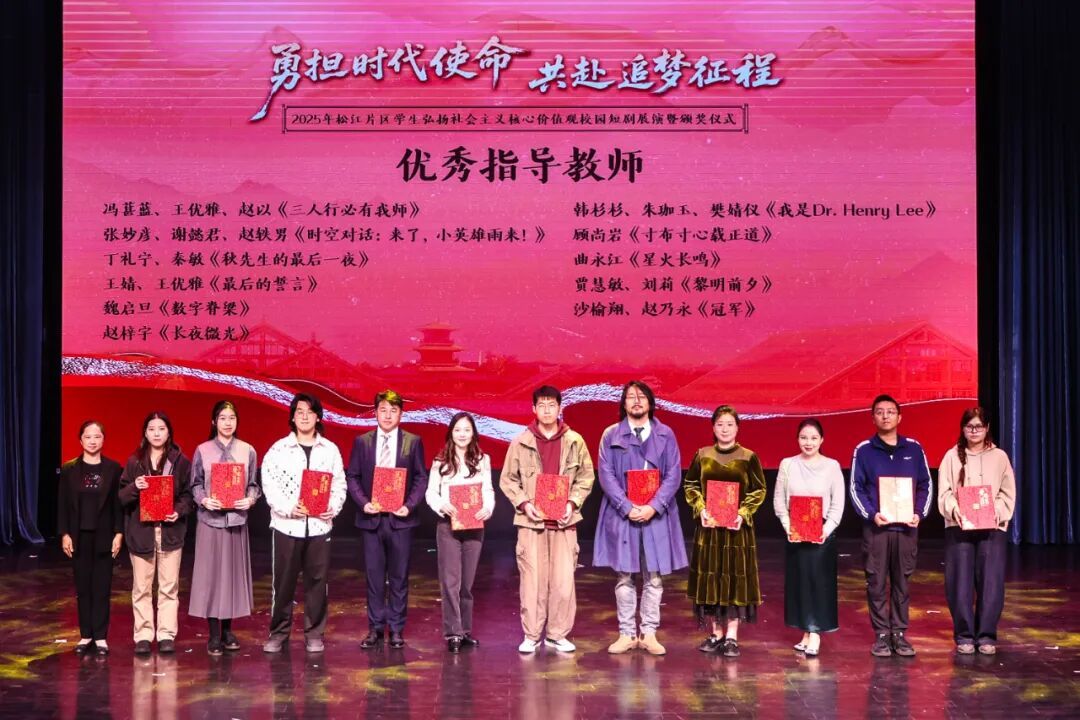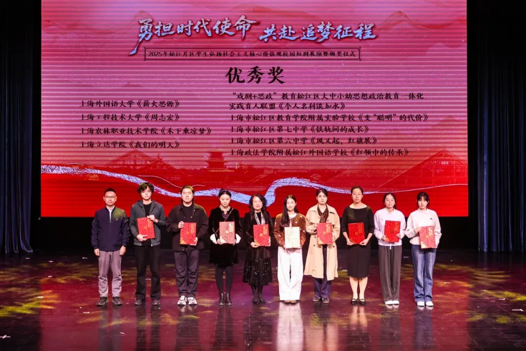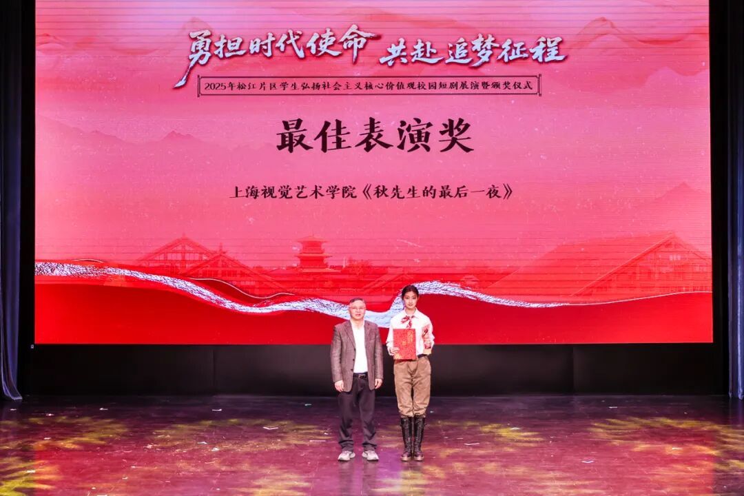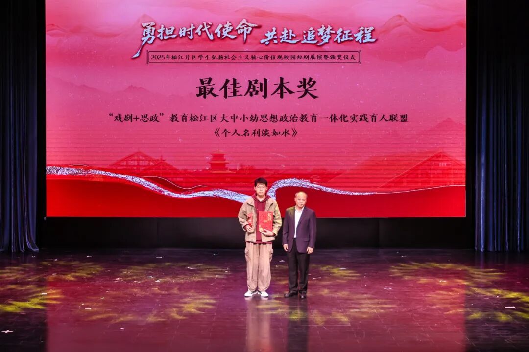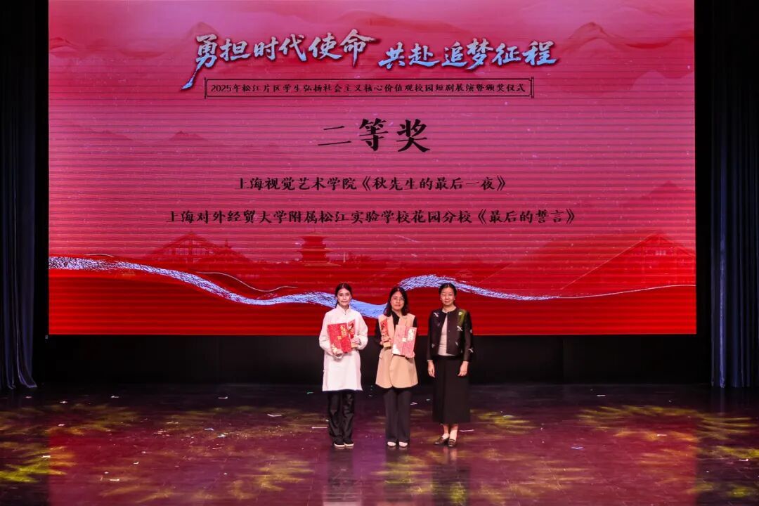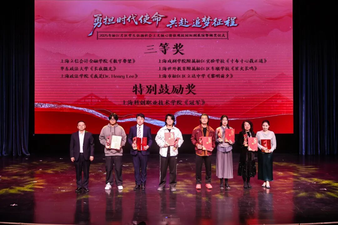 据悉,本次短剧比赛吸引了松江片区29所大中小学积极参与。现场对荣获一、二、三等奖的学校及优秀指导教师、最佳表演、最佳剧本等奖项进行了表彰。