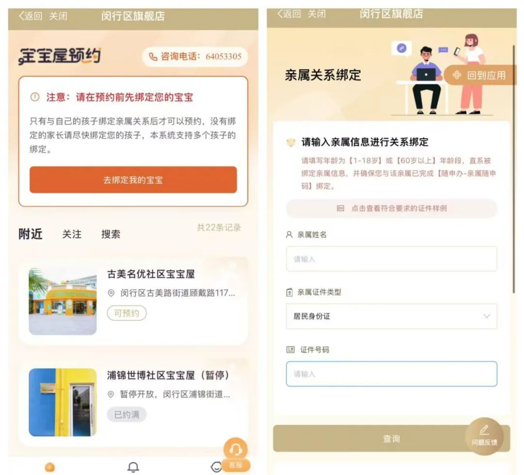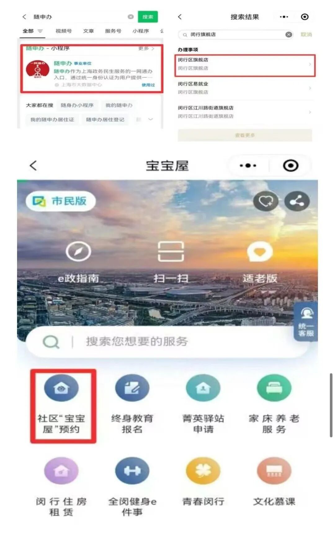 1.打开“随申办”App、“随申办”微信小程序或“随申办”支付宝小程序,搜索【闵行区旗舰店】,进入界面后点击【社区“宝宝屋”预约】。