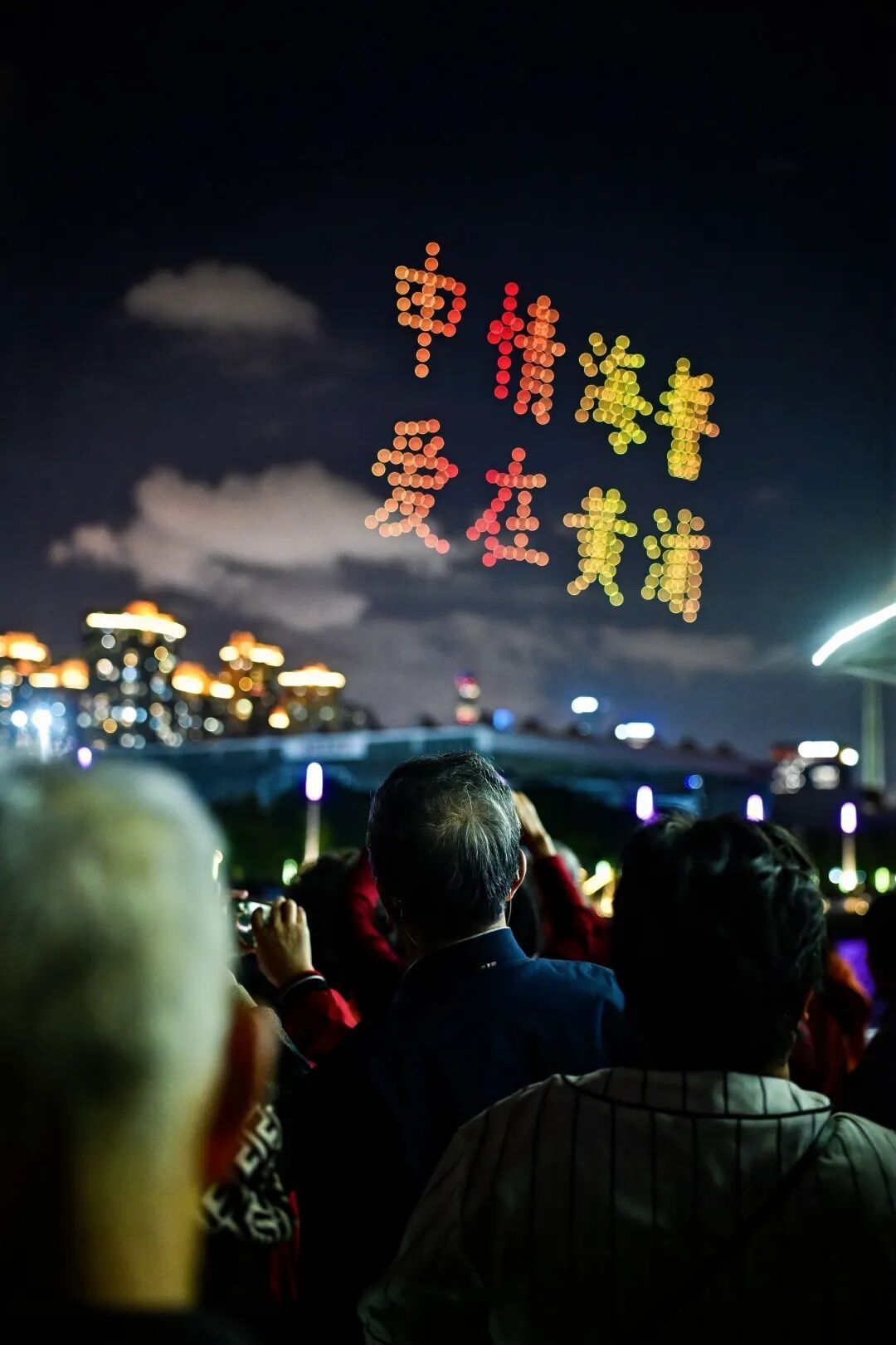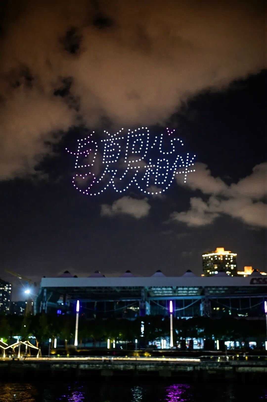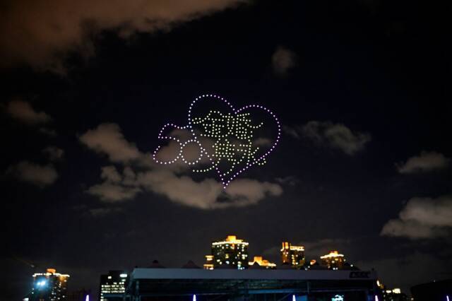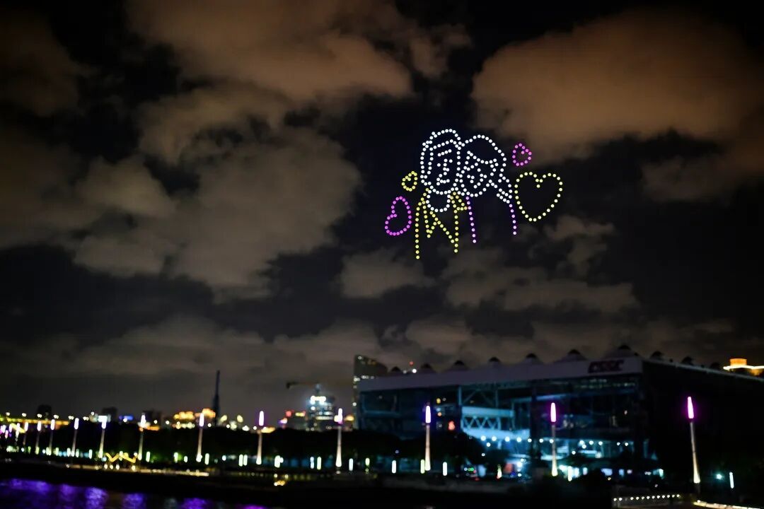 夜色渐深,金婚夫妇与新人携手登上游轮甲板,数百架无人机在夜空次第变幻:“乐龄金婚・幸福记”的活动主题字样在夜空亮起,随后爱心图案在暮色里缓缓舒展,鎏金“50”字样紧接着浮现,映亮江面,大红双喜造型横跨夜空……流动的光影与粼粼江波交相辉映,也载着黄浦江畔独有的浪漫与温情。