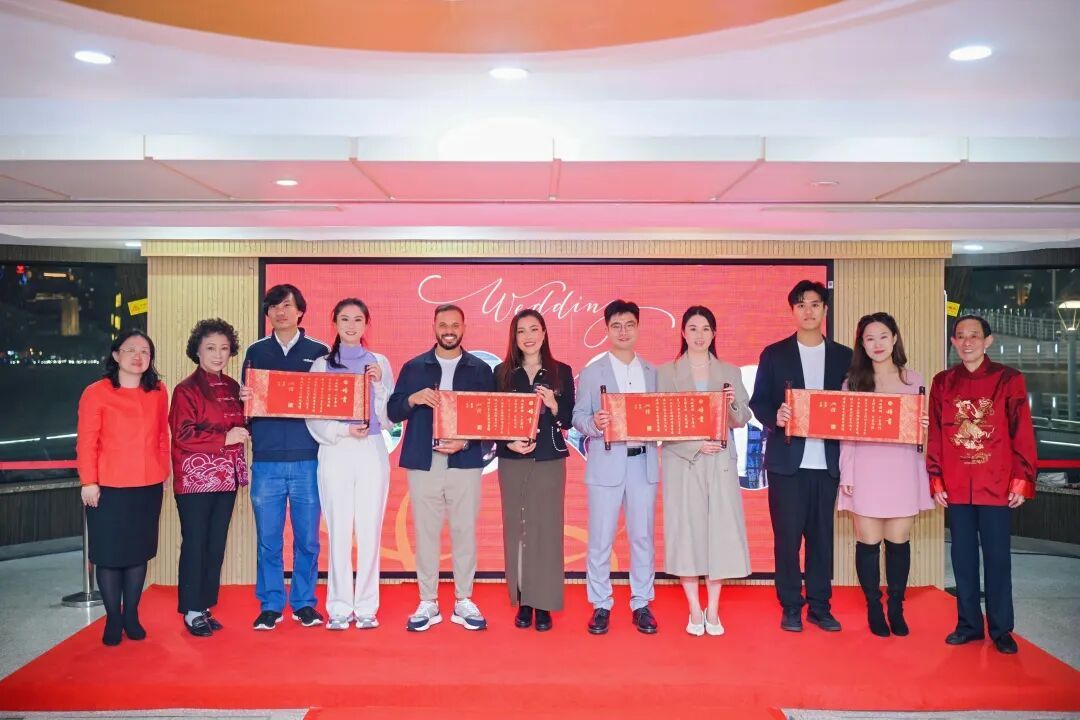 在“爱情接力”环节,五对新婚燕尔的夫妇在金婚夫妇与嘉宾的见证下接过订婚书,这份文书不仅是仪式的象征,更传递着“婚姻是家风延续”的深刻内涵。在集体问誓环节,真挚誓言随江风飘荡,与两岸灯火共同定格这代际传承的庄重时刻。