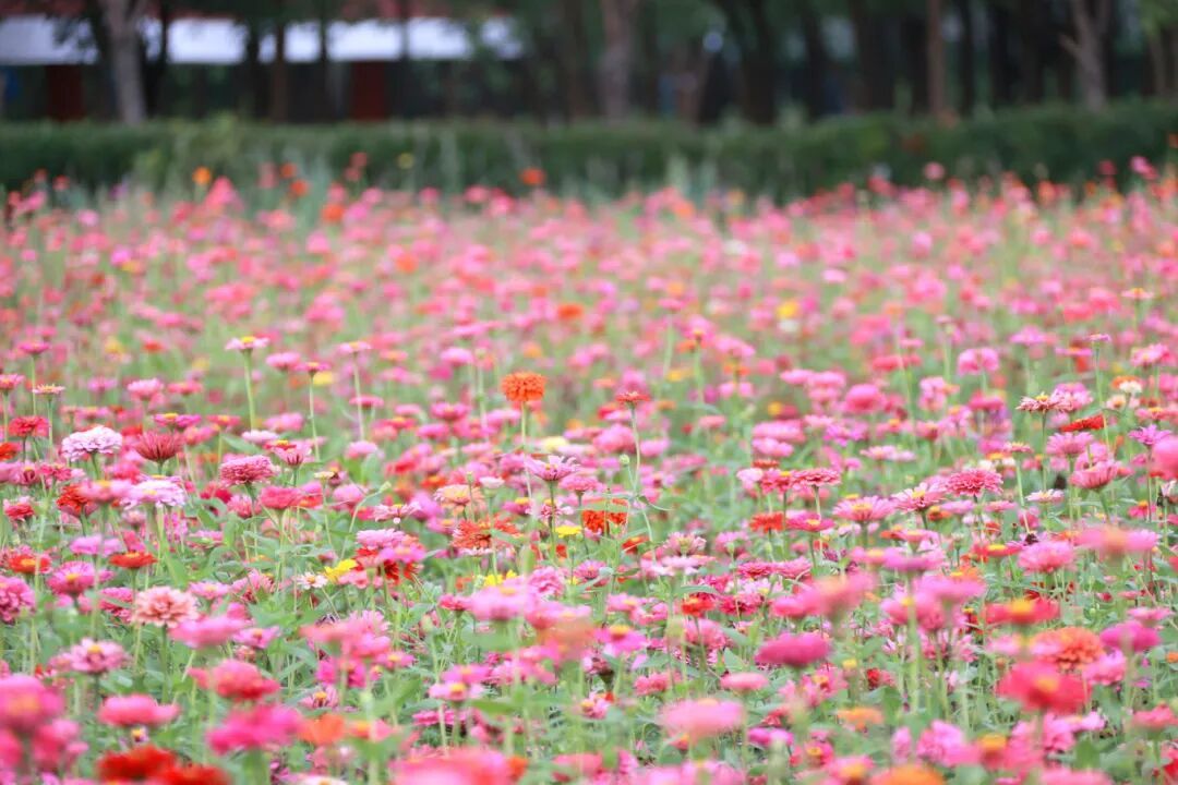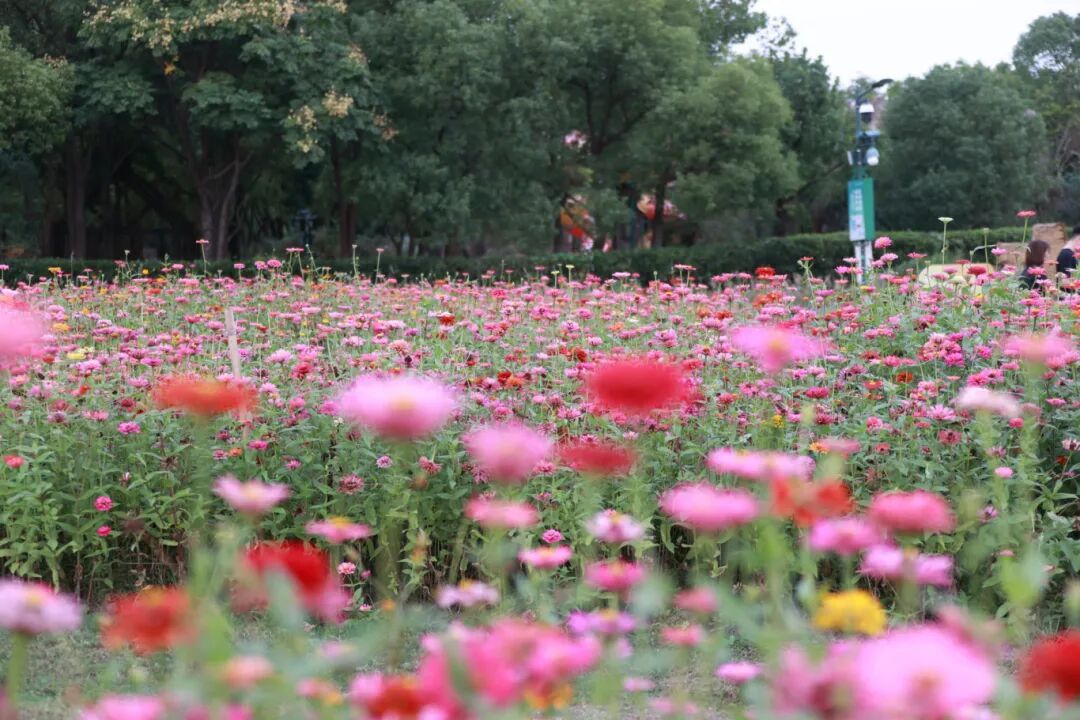 靠近公园1号门,成片的百日菊正热烈盛放。深红、明黄、亮橙、纯白、粉紫……各色花朵层层簇拥,连绵成绚烂的花浪,在阳光下交融成斑斓色块。远远望去,宛如一幅浓墨重彩的油画,在秋日晴空下熠熠生辉。