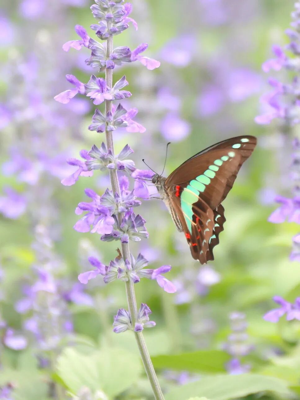 不远处,蓝紫色的马鞭草也正悄然绽放。修长的花茎托起穗状花序,无数细碎小花汇聚成一片片朦胧的云霞,随风泛起蓝紫色的涟漪,与百日菊的明艳交织出一场层次丰富的视觉交响。