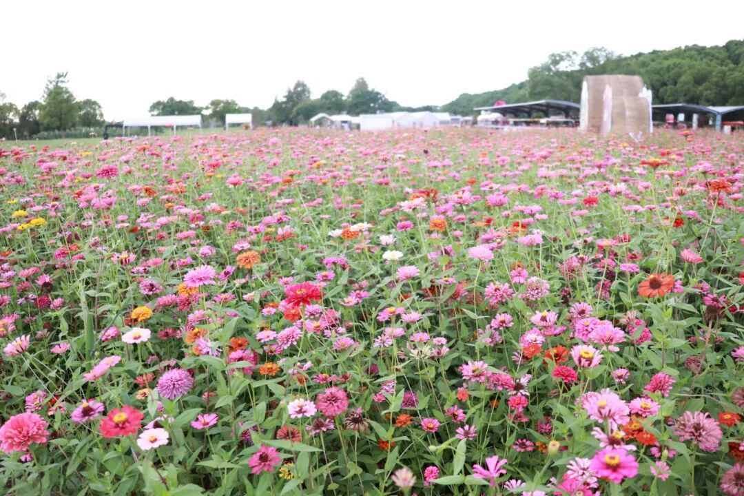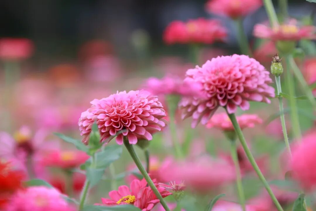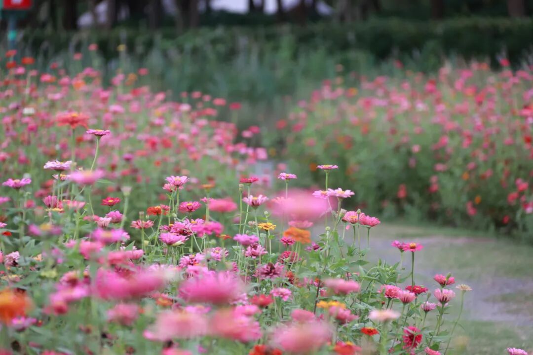 微风拂过,花枝轻摇,泛起层层温柔的花浪。空气中浮动着草木的清新与百日菊的淡雅芬芳,沁人心脾。