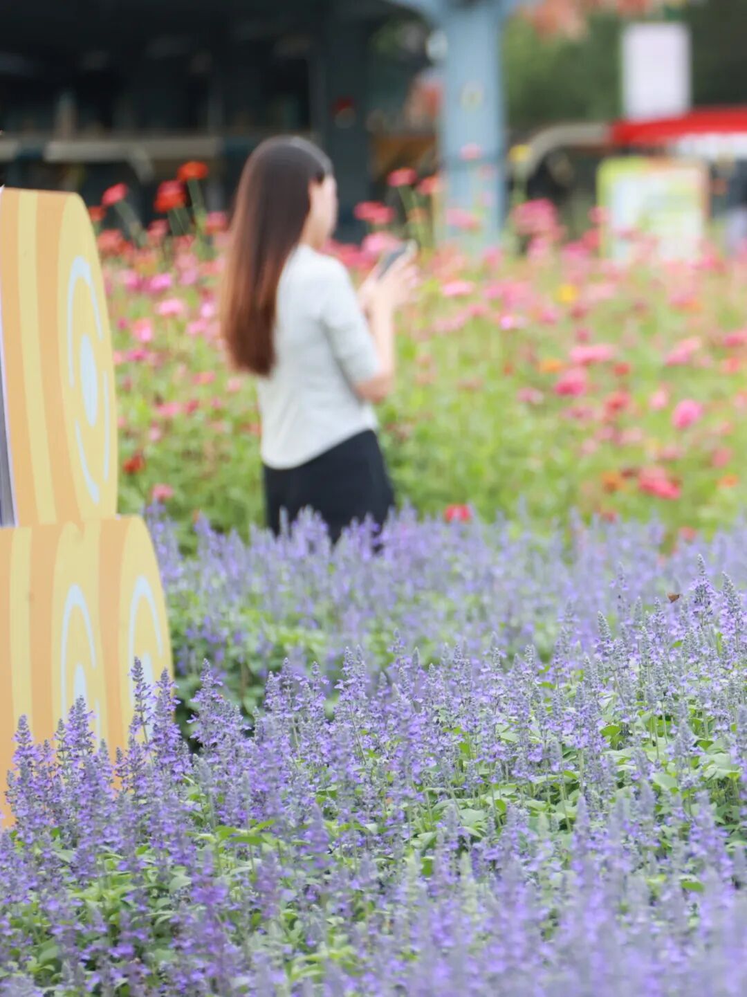 秋日已至,嘉北郊野公园内的百日菊、马鞭草热情“上线”,吸引了众多游客前来打卡拍照。