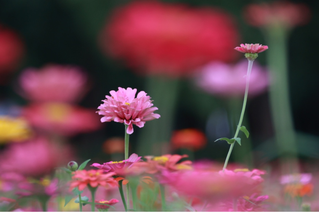 走近细看,每一朵百日菊都舒展着层叠的花瓣,宛如少女的裙摆,在微风里轻轻摇曳。绒质的花瓣边缘染着淡淡光晕,阳光倾泻,将花瓣照得通透,更显娇艳。