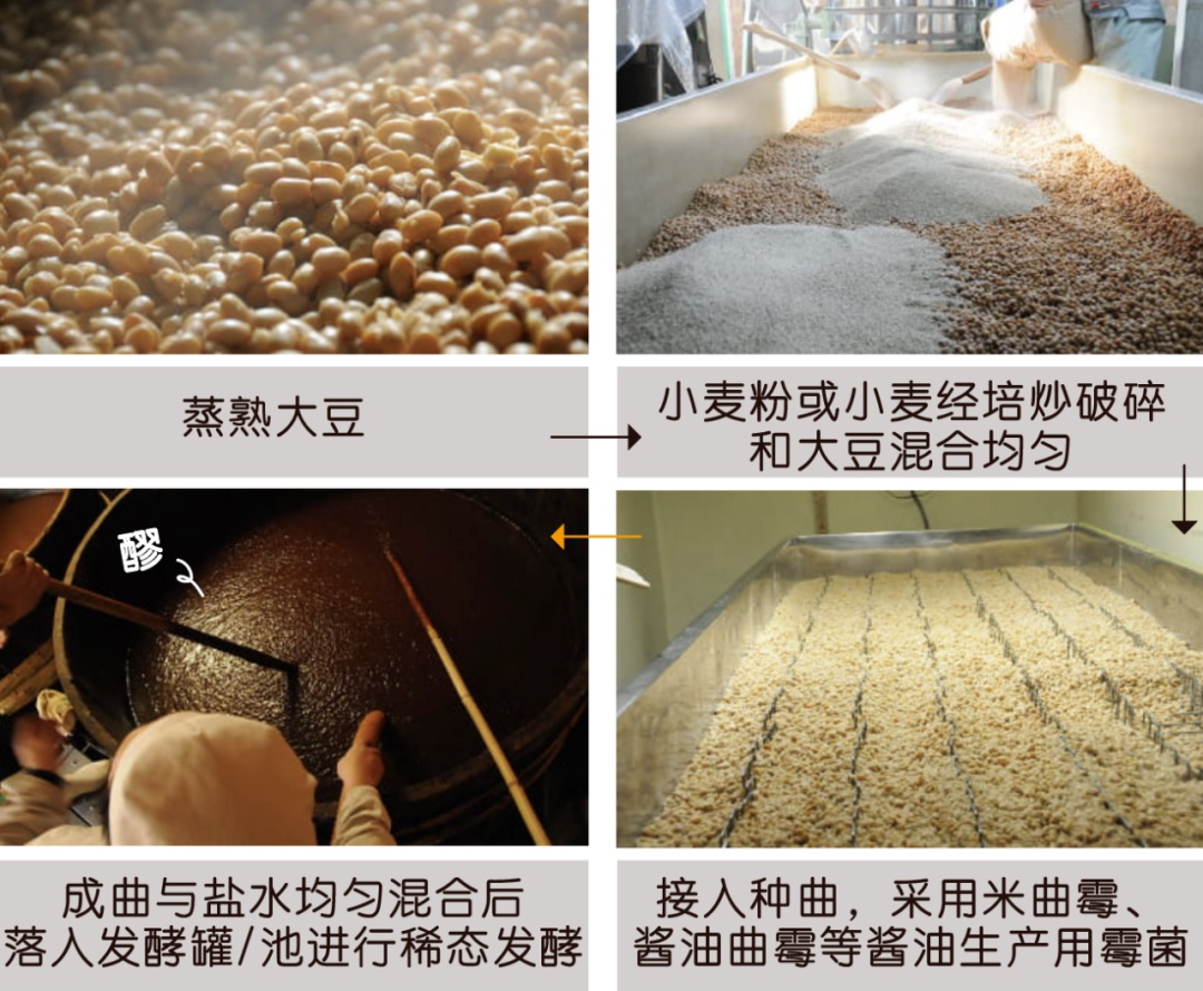 高盐稀态酿造酱油以大豆和/ 或脱脂大豆、小麦和/或小麦粉为原料,经蒸煮、制曲后与盐水混合成稀醪,直接进行稀态发酵。