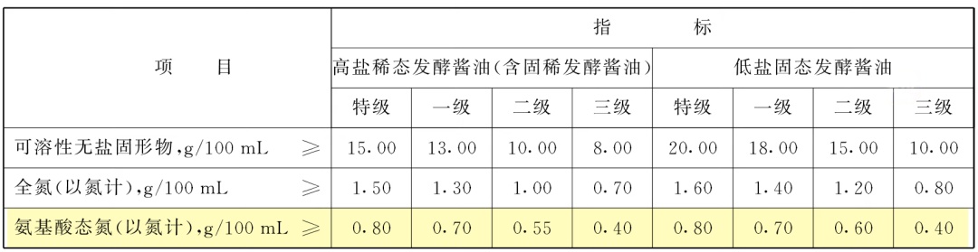 一般来说,酱油中氨基酸含量越高,说明蛋白质分解得越充分,酱油的鲜味和营养也更丰富。标准中的理化指标“氨基酸态氮”指的是以氨基酸形式存在的氮,其含量可以间接反映氨基酸的多少,因此常被用作衡量酱油品质的指标之一。氨基酸态氮含量越高,通常意味着酱油越鲜、质量越好。