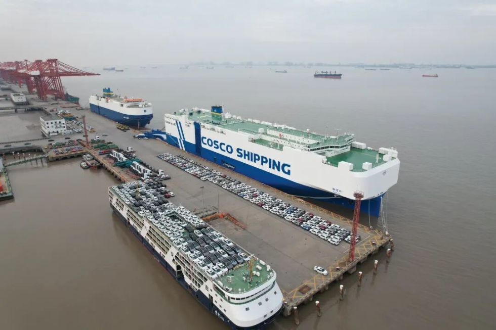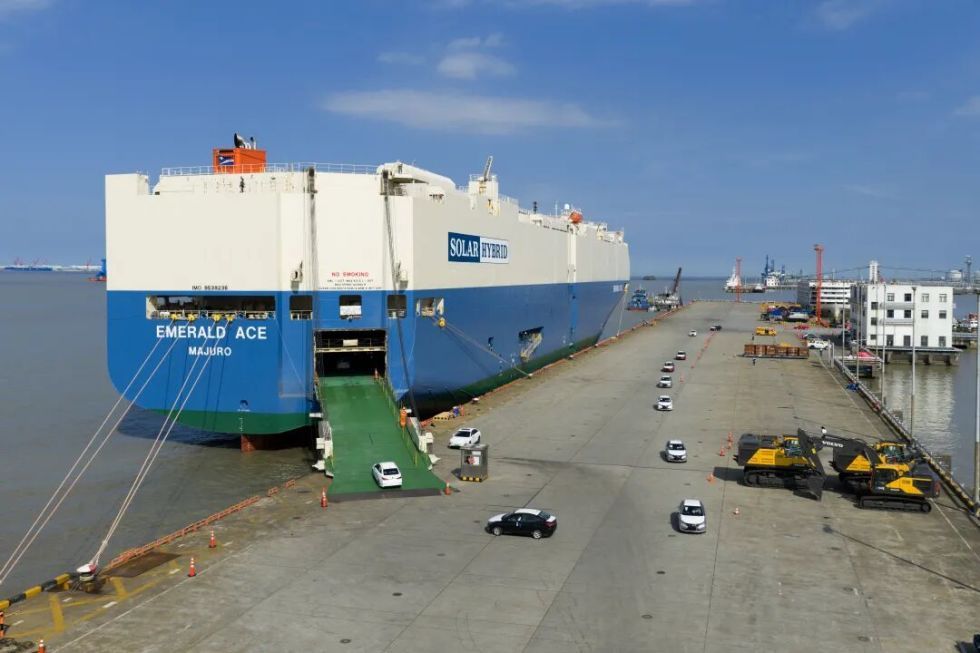随着码头上国产汽车滚装轮越来越多,中国自主品牌汽车出口实现了从“借船出海”到“造船出海”。在近年来中国汽车出口量激增的大背景下,为了降低巨大的物流成本,汽车企业选择造船买船,打造“远洋船队”来缓解运力不足和运费昂贵的问题。从2024年初首艘由中国船东投资建设的全球现役装载量最大的清洁能源船“上汽安吉申诚”号滚装轮在外港海通码头首航开始,“国轮国造、国车自运”已成为一种新常态。以上海汽车集团为例,就已拥有国内规模最大的自营整车物流船队,共计39艘滚装船舶。其中,今年5月投入运营的一艘大型滚装轮以9500个车位刷新全球最大装载量纪录。