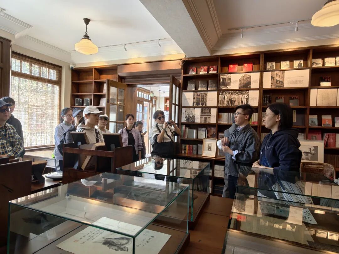 为保障听障人士清晰获取历史信息,活动全程由街道市民驿站协调高级手语翻译寇辰珠提供同步翻译服务。在1927・鲁迅与内山纪念书局,经精心改造的场景成为参与者关注焦点。讲解员介绍,书局依据老照片实现大部分场景复原,书架布局、灯光效果均还原百年前风貌,现场展示有鲁迅翻译的拜伦、莎士比亚著作,以及马克思、恩格斯等左翼文化人士推崇的原版书籍。尤为特别的是,1927・鲁迅与内山纪念书局内鲁迅曾用于会客的四把藤椅中,有一把因适配鲁迅身材专门定制,尺寸略小于其他三把,这一细节吸引听障人士纷纷驻足观察。此外,讲解员还分享了书局与鲁迅的故事,包括以店员名义代租拉摩斯公寓、大陆新村两处居所保障其安全,中转手稿与书信规避出版限制等史实。