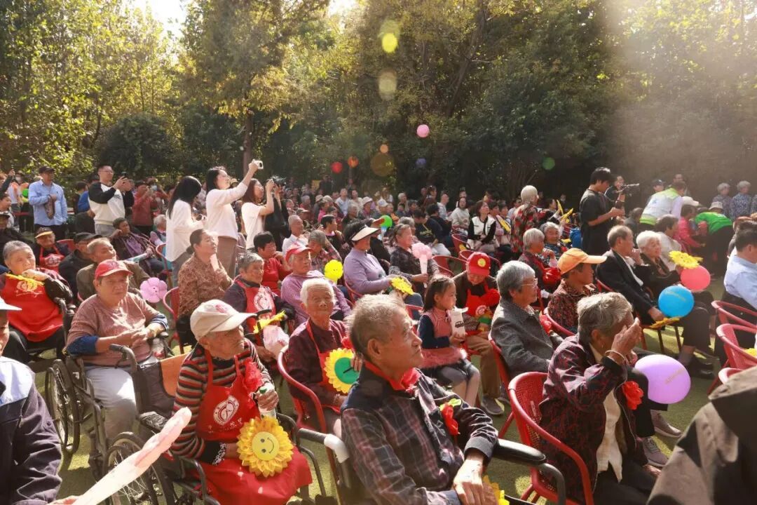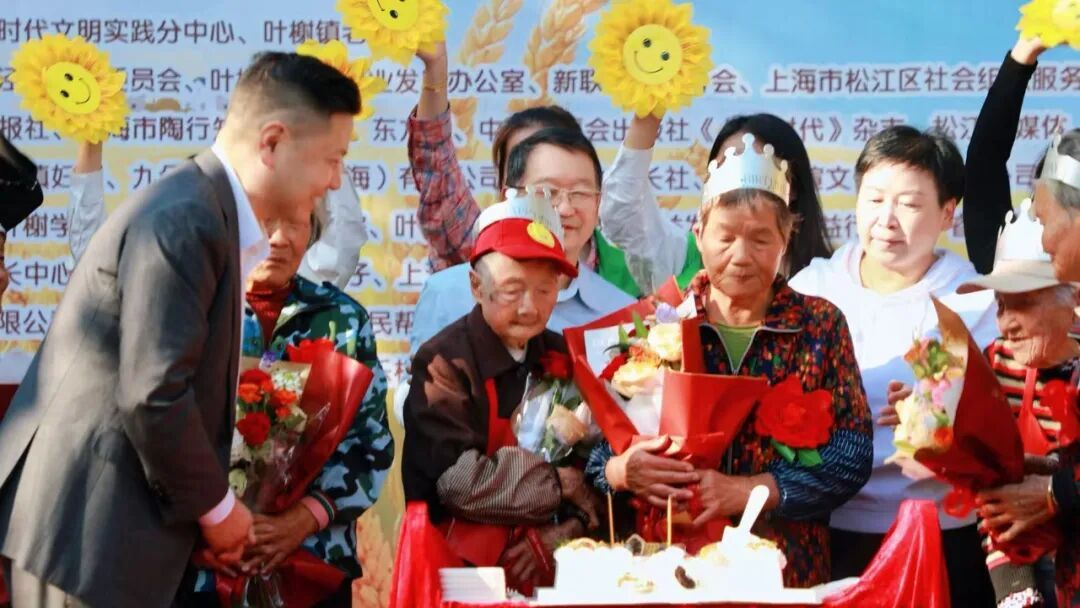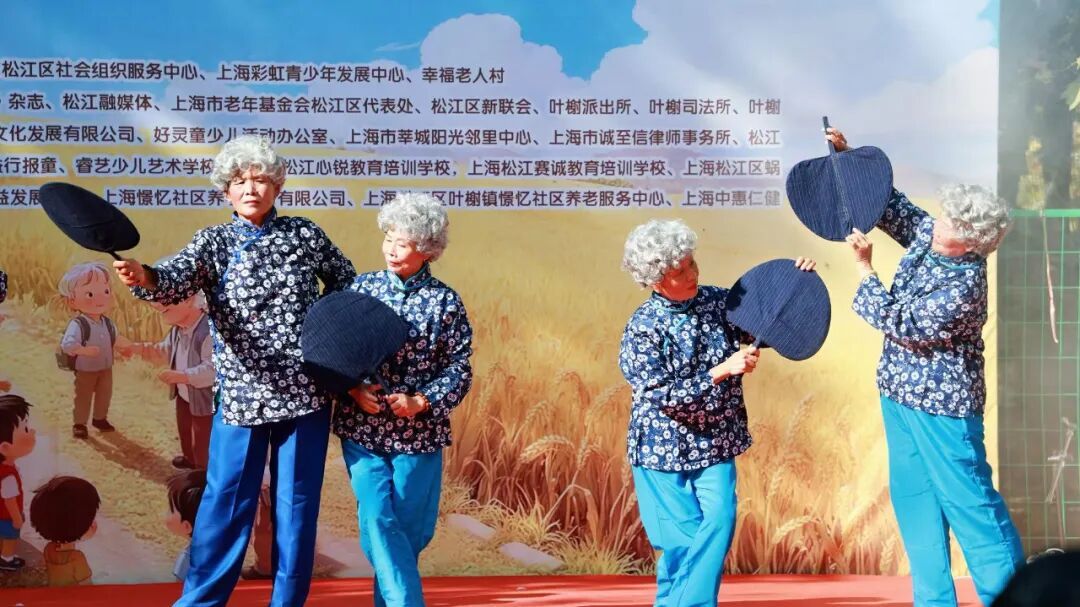 紧接着,以“爱在重阳”为主题的村天里音“悦”会上演。一曲由乡村乐队带来的《有风无风皆自由》瞬间点燃全场气氛。舞台中央,老人们换上由叶榭非遗筘布制作而成的传统服饰,手持蒲扇,步伐轻柔。一曲舞毕,舞蹈表演《弄堂谣》获得台下满堂喝彩。伴随鼓点声起,来自蜗牛宝贝成长中心的多名“蜗牛宝贝”携手老人走至台前,歌舞表演《玛尼情歌》更是将全场气氛推向高潮。