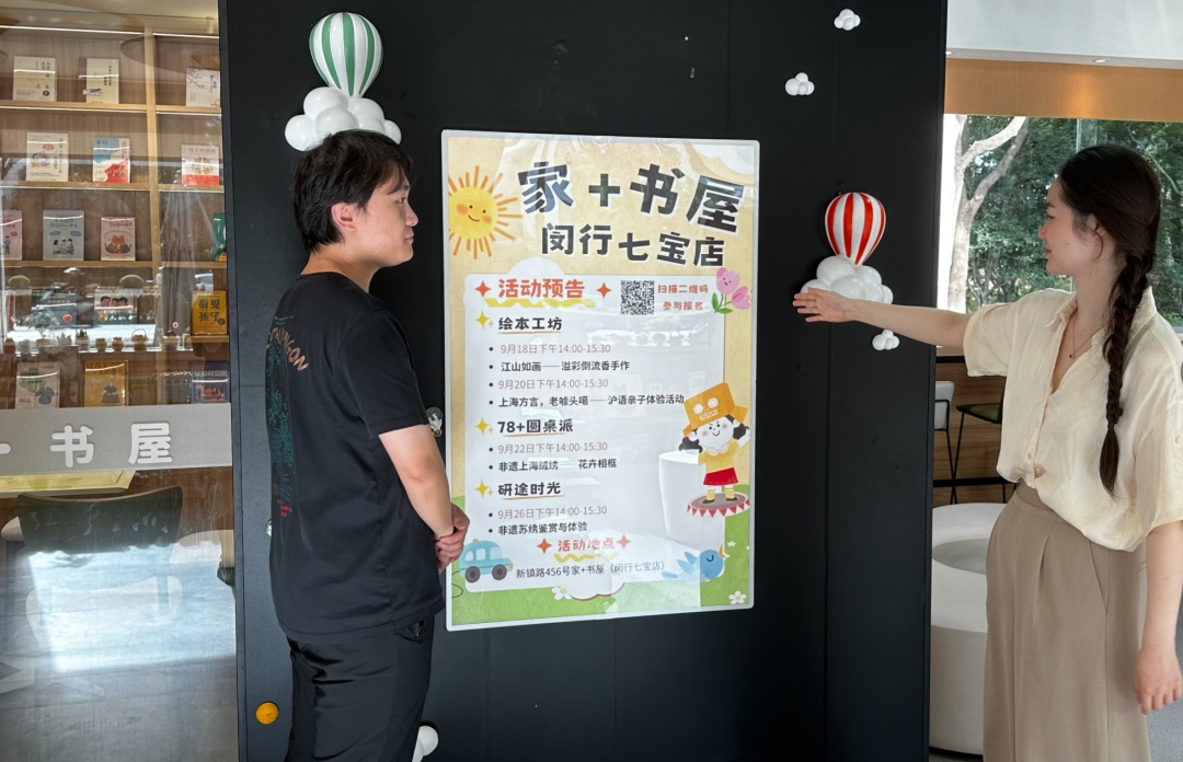 高慧凝大学专业是幼教,熟知儿童心理学,毕业后在上海书城任职,积累了运营书店、执行活动的经验。今年六月,高慧凝在多方推荐考核后,成为了“家+书屋”(闵行·七宝店)主理人,与副店长柴皓哲俩人一起开启了忙碌的筹备工作。