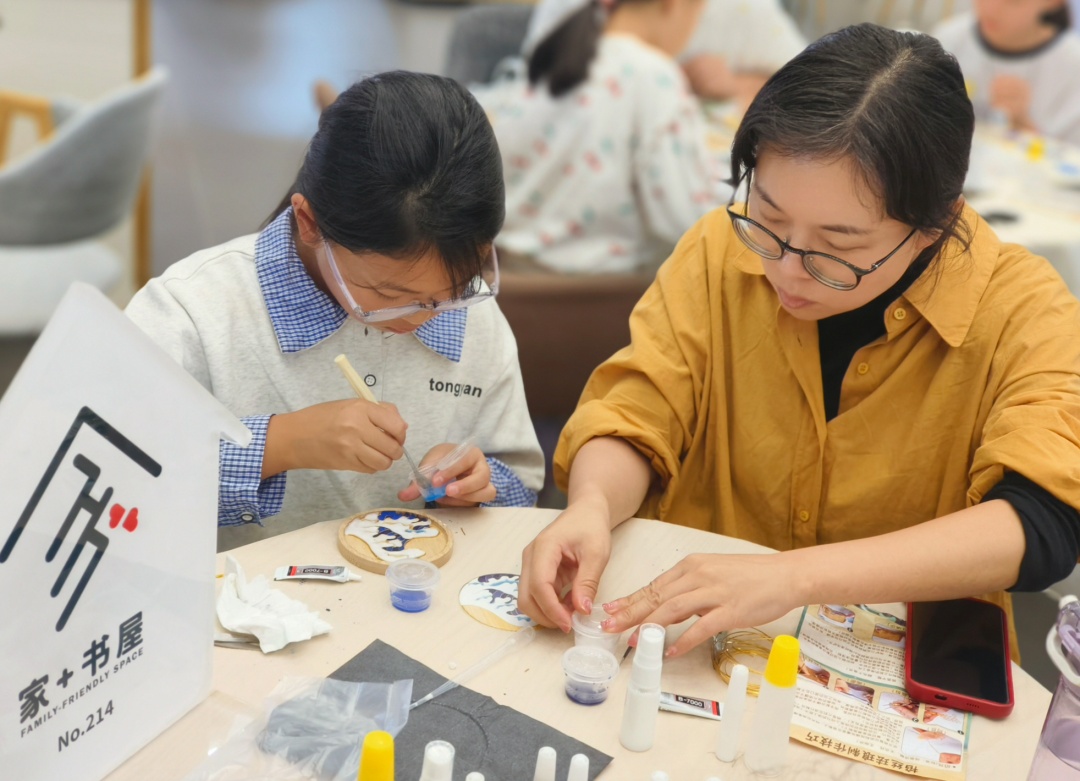 走进书屋,咖啡吧前坐着不少读者,他们时而伏案工作,时而阅读书籍,时而看向窗外放空身心;书屋核心阅读区,高慧凝正在更新近期讲座活动课程安排,为前来询问的读者介绍课程。往里走,三个阅读体验区划分清晰,周末的午后,经常可以看到妈妈们带着孩子在这里共读绘本。活动空间中,不同精彩活动轮番上演,亲子互动氛围良好。这是“家+书屋”营造的温馨场景——阅读不再是孤独的探索,而是亲子间温暖的对话。