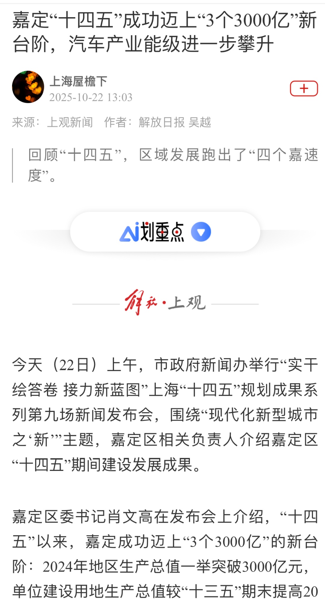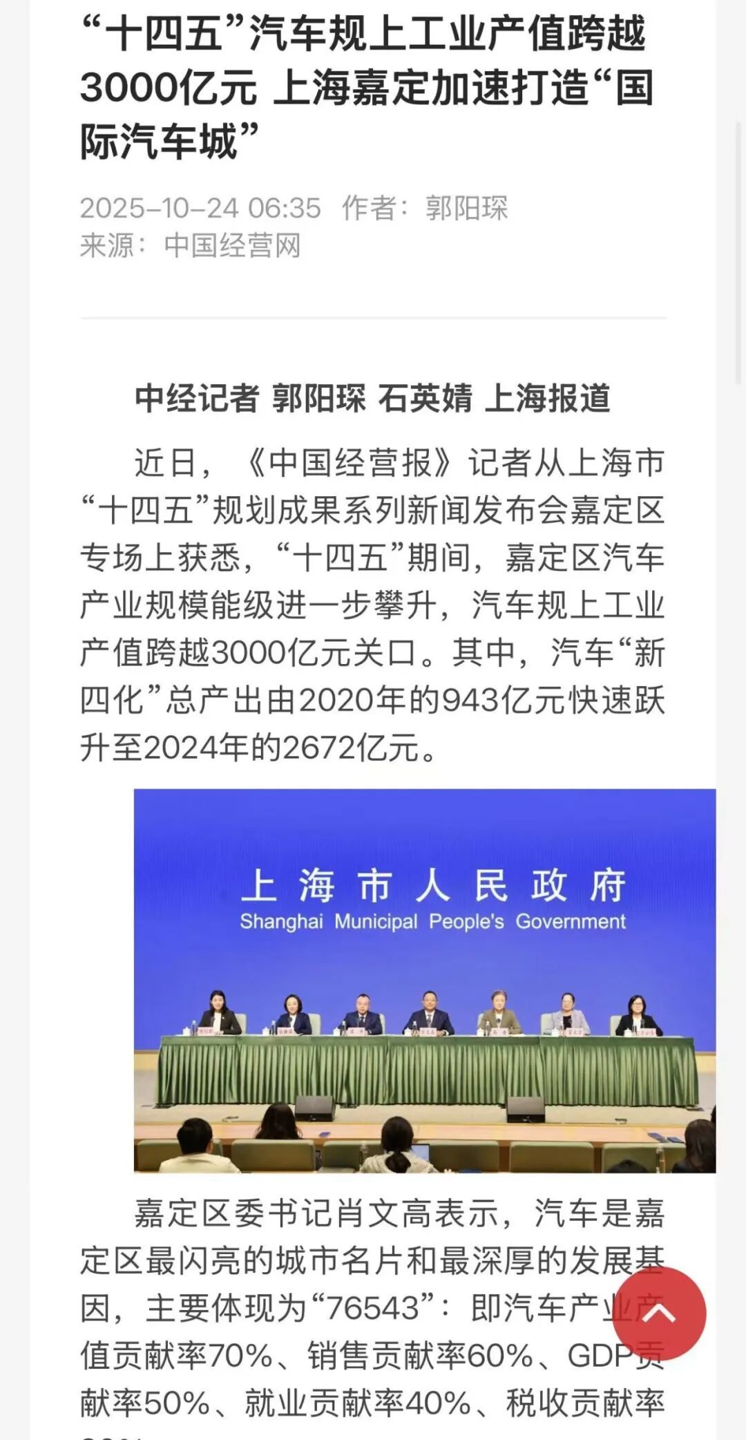 央视新闻:《“十四五”期间 上海嘉定汽车规上工业产值跨越3000亿元关口》