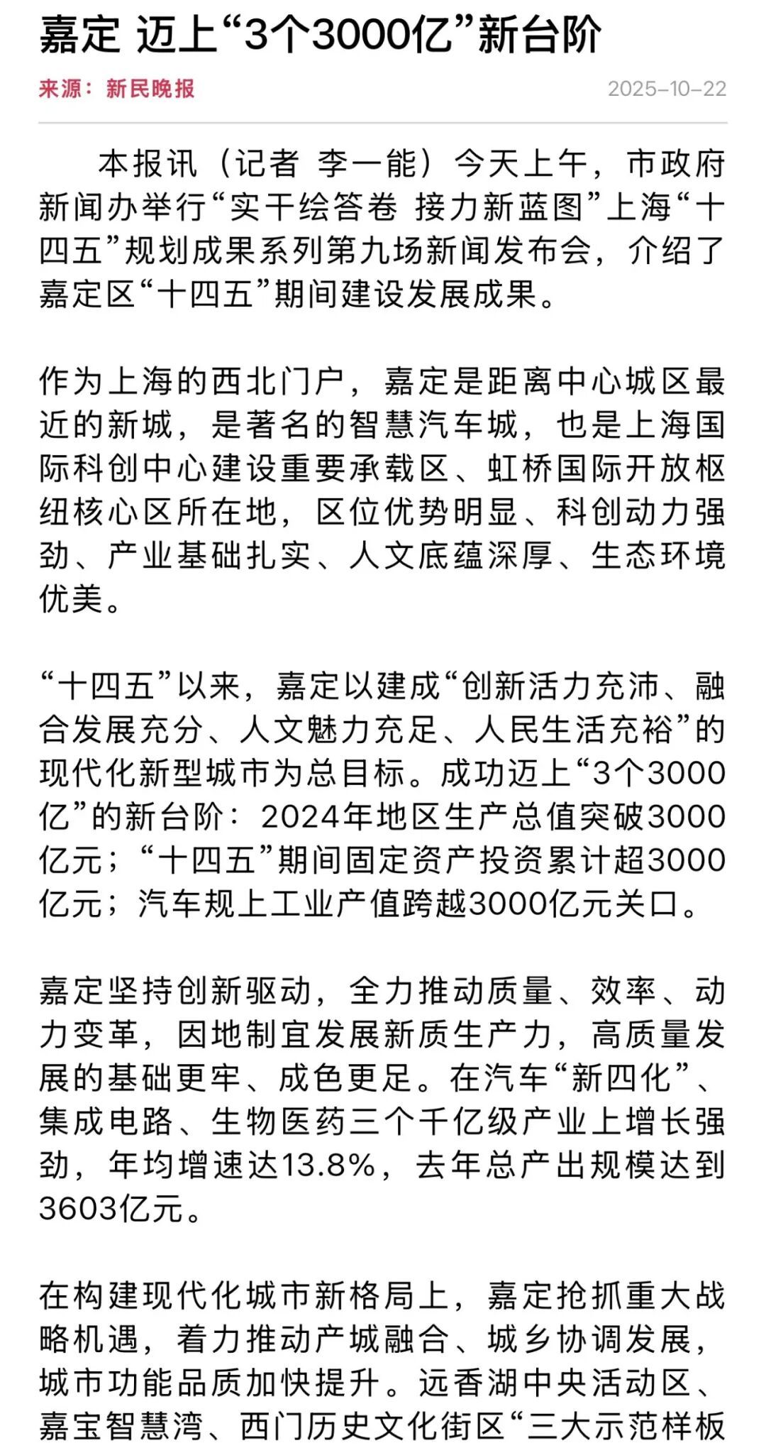 《上海嘉定 “十四五” 迈过 “3个3000亿”大关》