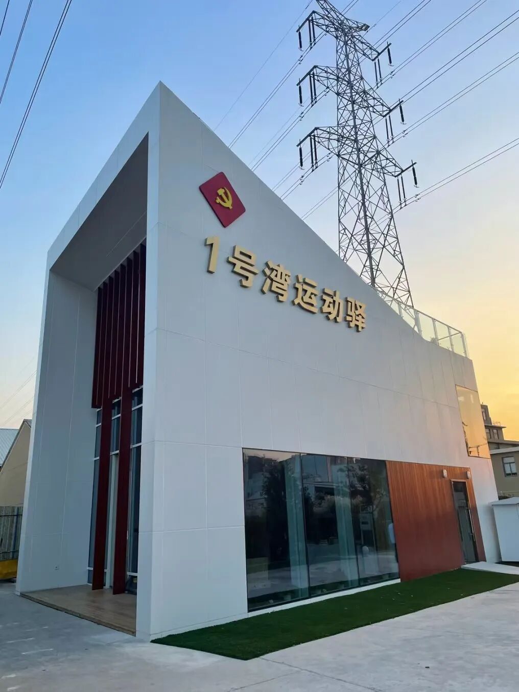 1号湾运动驿位于宝山区庙行镇蕰藻浜南岸,是滨水步道沿线的“低碳+运动”主题党群服务站,2023年12月正式开放。