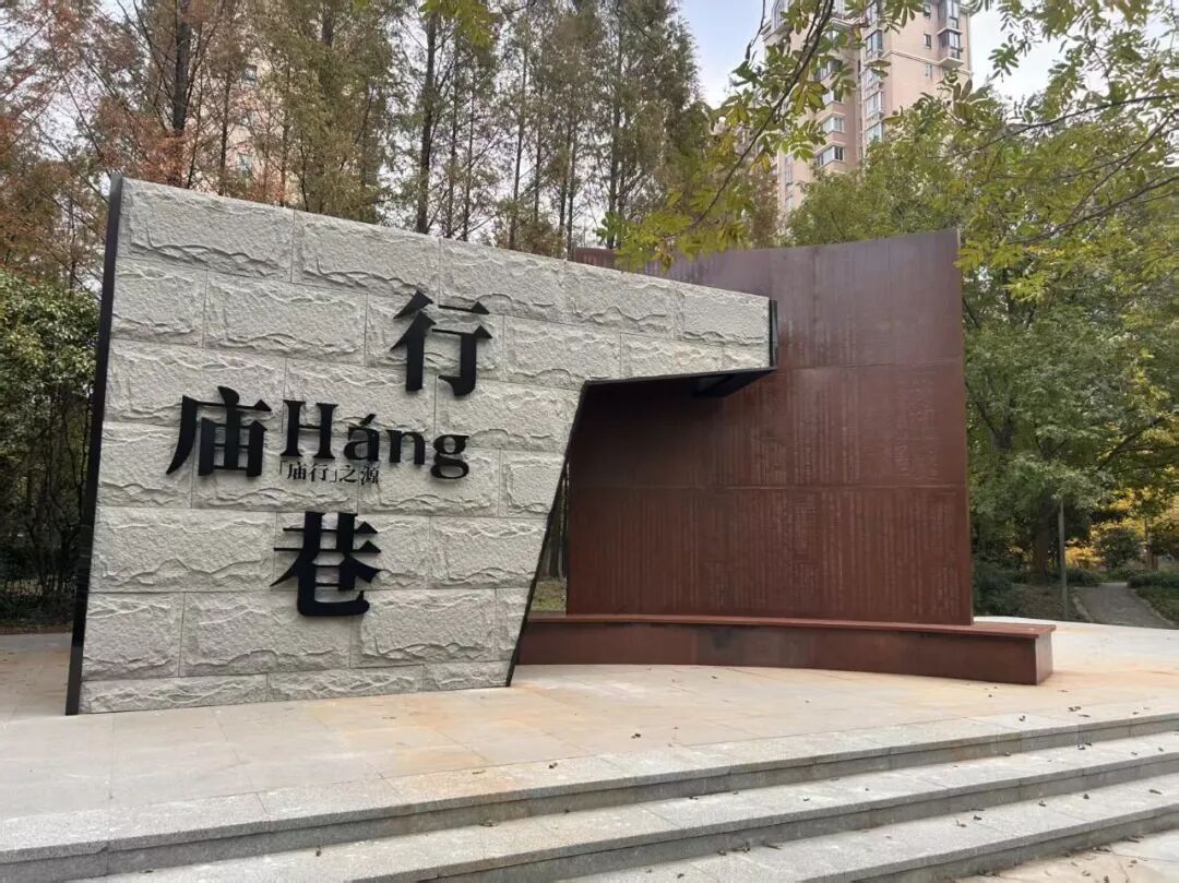 庙行之源位于东茭泾东岸,南蕰藻路南侧,以巨型钢结构报纸造型为主体,镌刻有“庙巷大捷”历史场景,于2024年随东茭泾公共空间贯通工程落成开放。