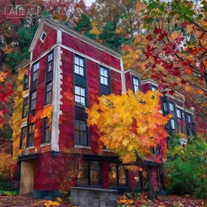 整栋建筑被红、黄等色彩的藤蔓与秋叶大面积覆盖,规整排列的窗户如同画布上的方格。周围的树木色彩绚烂,红、黄、绿交织,建筑仿佛彻底融入了秋日的森林画卷,AI创作出一幅充满梦幻感的《秋日共生》图。