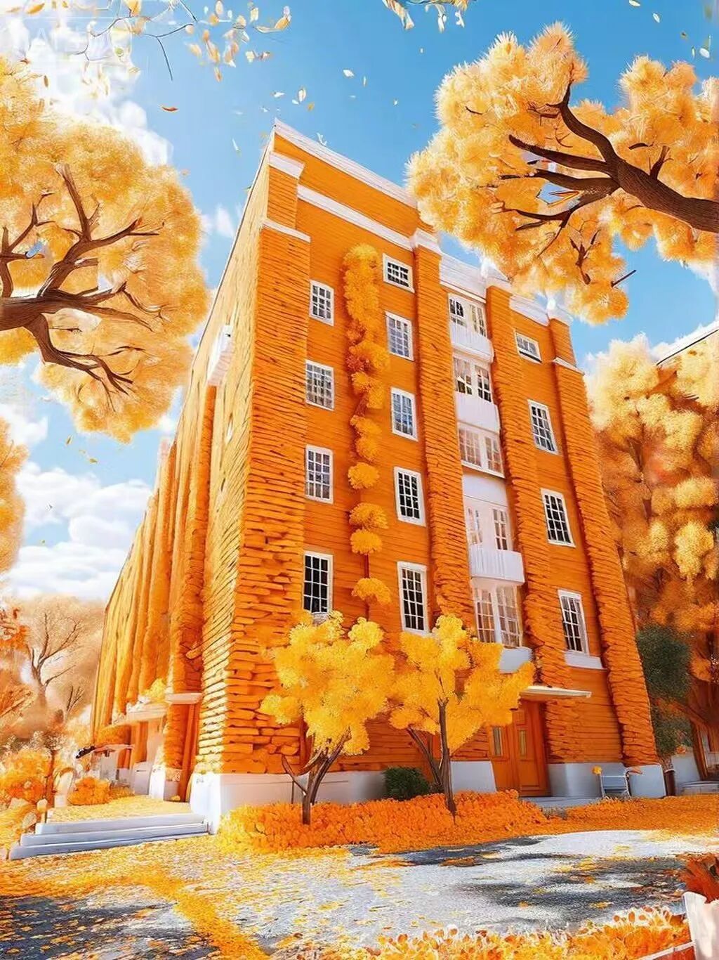 一栋充满现代感的橙色建筑静静矗立,规整的墙面肌理与攀附其上的黄色藤蔓形成了有趣的对话。周围环绕着金黄的树木,鲜亮的叶片在蓝天映衬下如同数字渲染般夺目,飘落的树叶与满地黄叶,共同构成一幅秋日氛围明朗浓郁的AI画作。