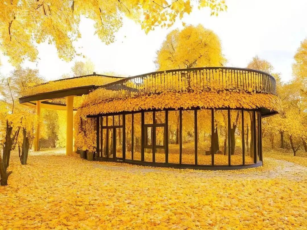 一座造型独特的圆形建筑静立其中,其屋顶和外侧被纯粹的金黄色叶子满满覆盖,黑色的窗框与栏杆勾勒出精致的线条。周围的树木与地面皆是一片辉煌的金色,AI以其纯净的色彩,构建出一个明亮、梦幻的金色童话世界。