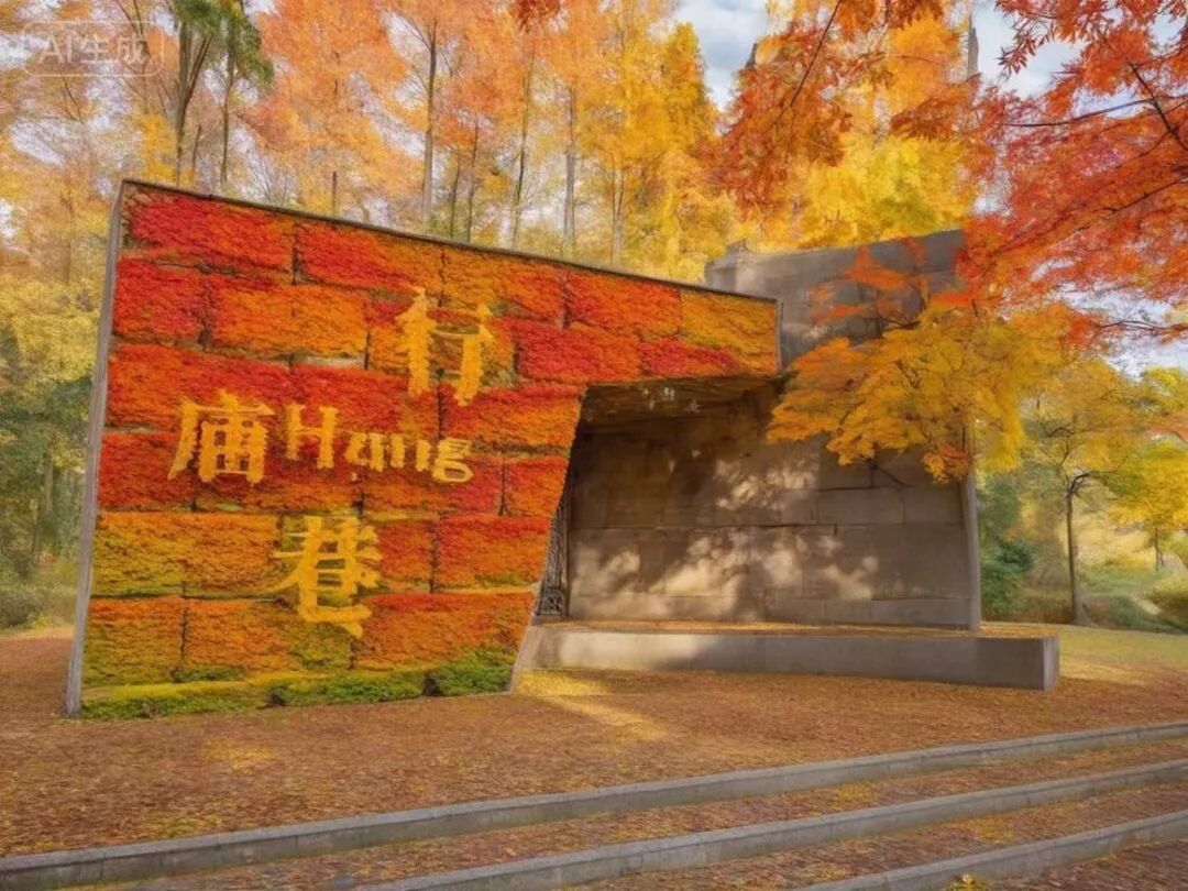 一面独具特色的墙体成为视觉焦点,红、橙、黄的秋叶构成了它最自然的装饰,墙面上斑驳的字样仿佛是对这片土地的温柔注解。背景是斑斓的秋林,满地落叶更添静谧,AI以高超的技法渲染出这份深邃的秋意。