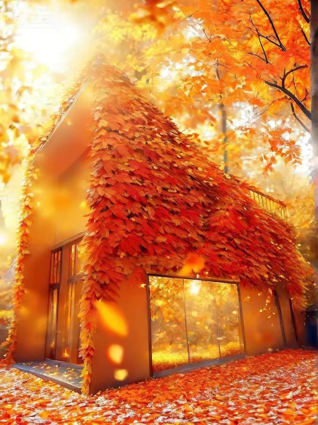 建筑的屋顶与部分墙面被橙红色的秋叶密集地覆盖,阳光透过金色的叶片洒下,为整个场景镀上一层温暖的滤镜。明亮的玻璃窗与满地橙红落叶相呼应,AI精准地计算光影,营造出温馨而梦幻的氛围。
