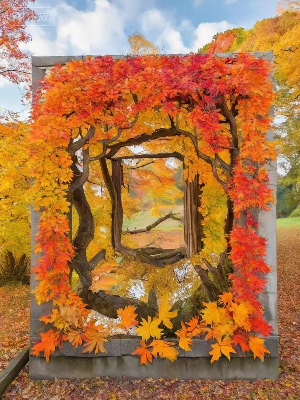 由树木枝干与五彩秋叶自然构筑成一个“框架”艺术装置,红、橙、黄的叶片成为画框本身。透过框架,秋日的林间景色如同一幅被装裱的流动油画。AI巧妙地将自然与艺术结合,创造出诗意的视角。