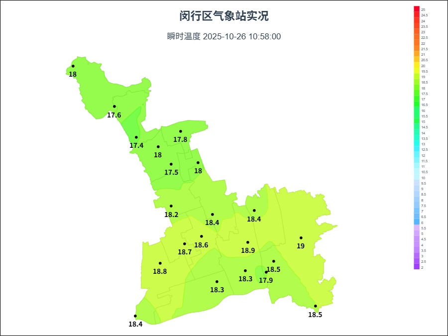 今天上午阴到多云局部地区短时小雨,下午到傍晚转为多云天气。早间气温较低,闵行国家基本气象站为17℃,今天最高气温19.1℃,体感较凉。