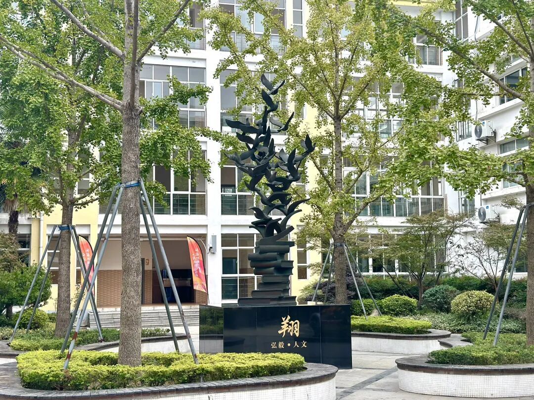 四棵杏树中间,是一座以鲲鹏形象为蓝本的雕塑,名为“翔”,希冀弘文学子经历九年积淀,像鲲鹏一样云游天地之间。