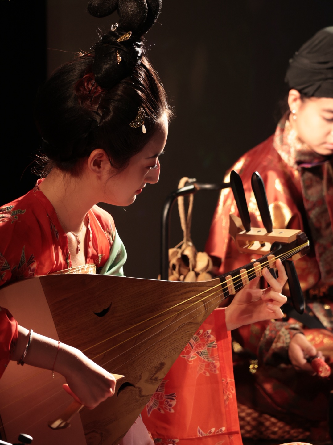 本次活动中,我们将以这件扁壶为起点,穿越回大唐的乐舞盛世。指导老师将带领大家亲眼辨识三种唐代琵琶的独特形制:五弦直项琵琶的端庄、四弦曲项琵琶的异域风情以及阮咸的灵巧精致,了解它们各自不同的音色特点与演奏方式。