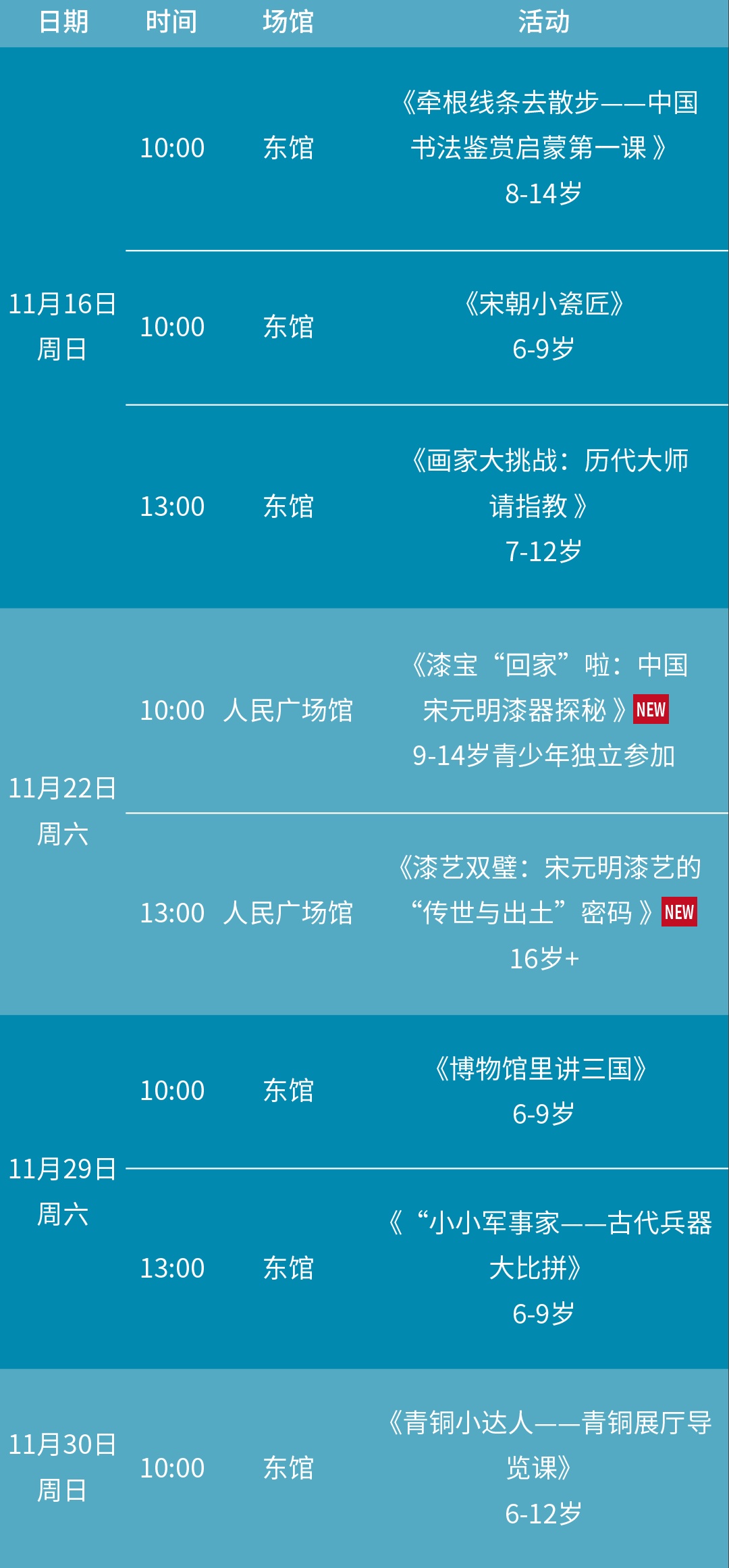 从古代军事、三国风云,到唐宋漆器、雅致宋瓷,再到书画线条,十一月上博学院多主题活动齐上线,邀你跨越时空、“艺”起逛馆,还能体验剪纸与瓷器上釉、螺钿手作。