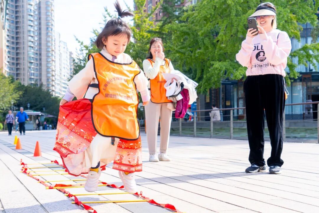 活动以“健康”为主线,精心设计了四大主题打卡点,将健康知识转化为趣味挑战。黄金城道上的“营养投投乐”区域,孩子们在游戏中认识“膳食宝塔”,记住“每天要吃五色蔬菜”的口诀;融·古北驿站的“‘手’护健康”环节,亲子组队完成“七步洗手法”挑战,在默契配合中巩固了卫生习惯;古北市民中心站的“情绪小怪兽”“信任盲行”则引导家庭关注情绪表达与彼此信任。一路集章打卡,家长与孩子既锻炼了身体,又在协作中收获了健康知识与情感共鸣。