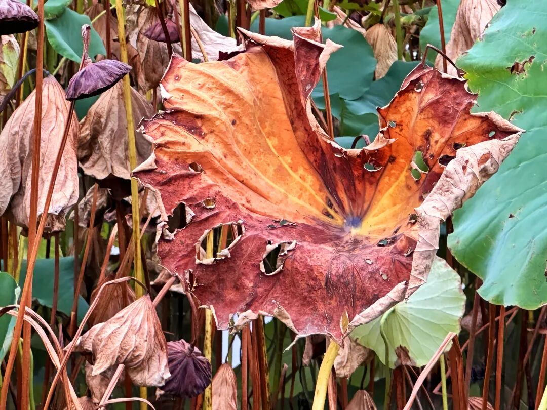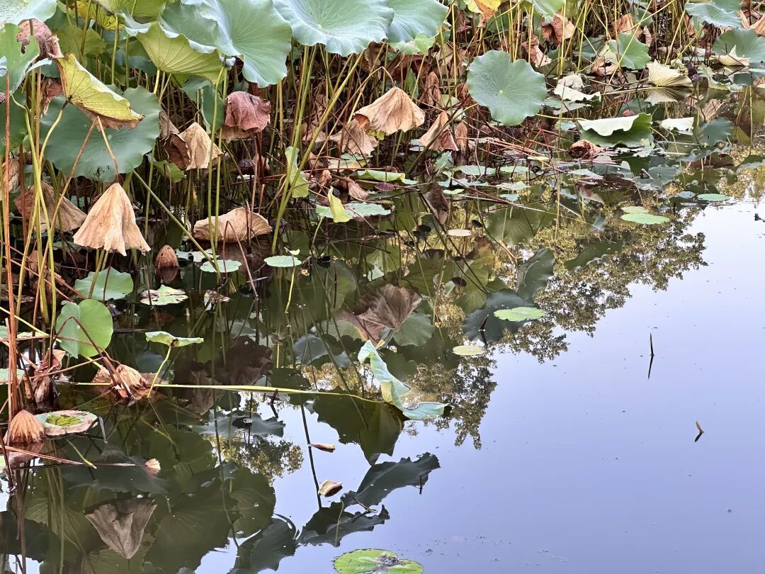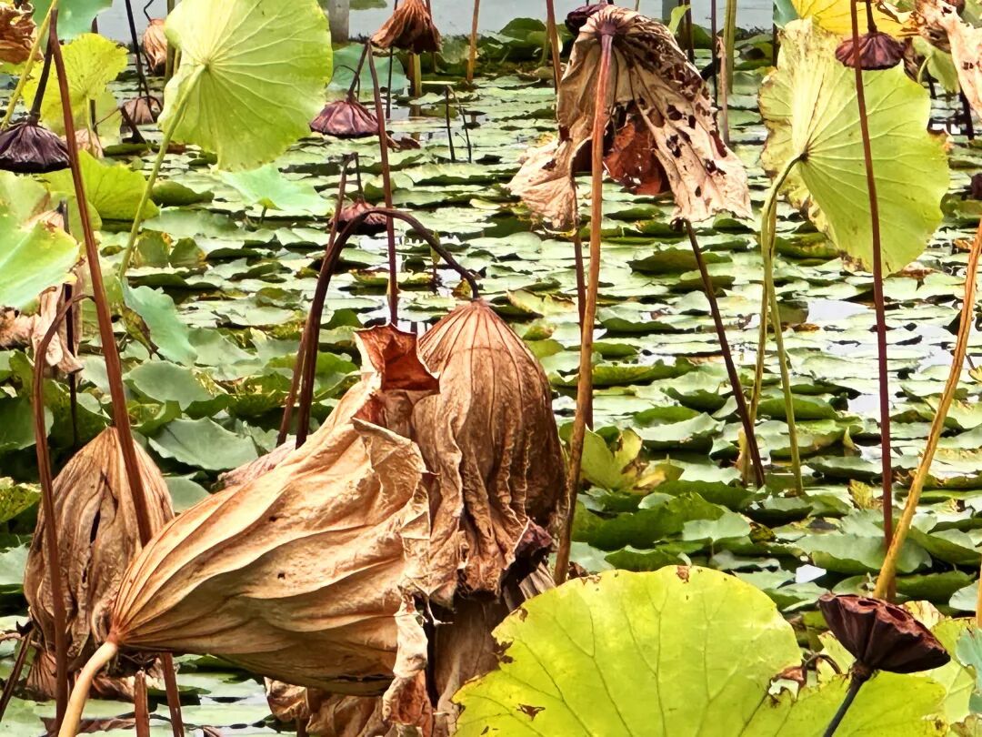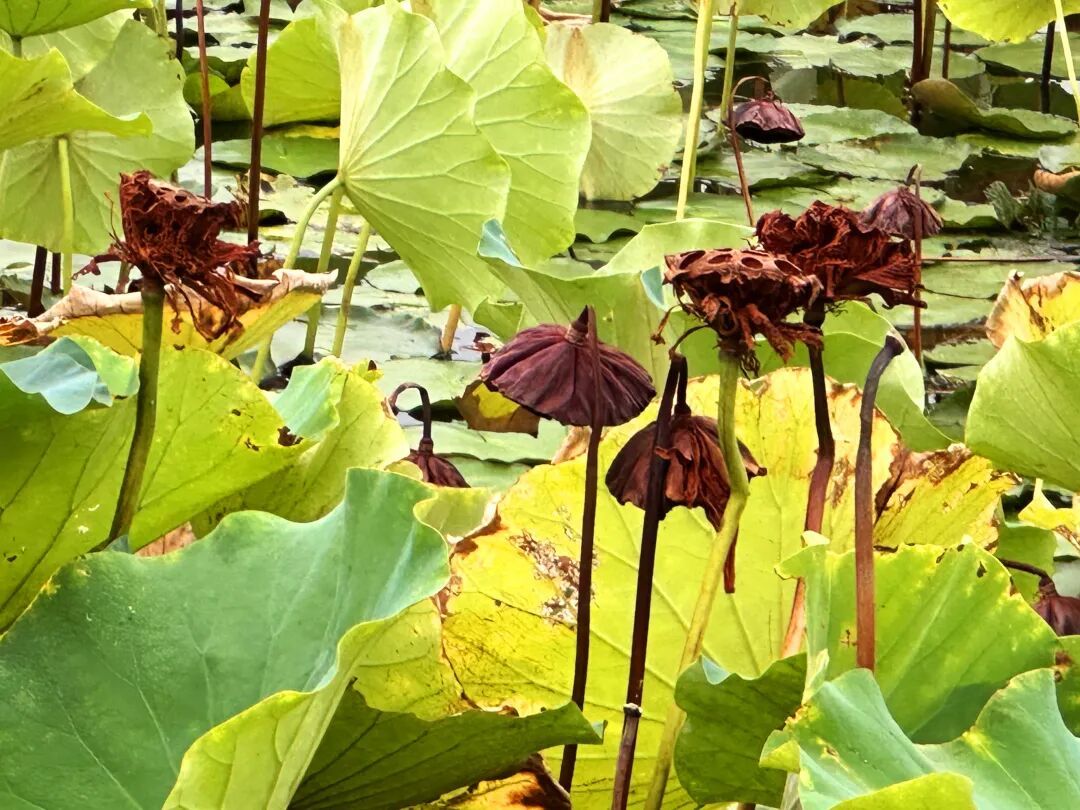 站在闵行体育公园、闵行文化公园和莘庄公园、莘庄梅园的荷塘边眺望,再不见夏日里“接天莲叶无穷碧”的盛景。曾经碧绿舒展的荷叶,如今已染上了深浅不一的焦黄,浸着枯萎。原本饱满翠绿的莲蓬,眼前也变成了枯黑干瘪的模样,透着萧瑟。连茎茎秆秆都没了往日的鲜活,垂在枯黄的荷叶间,沉在塘边的浅水里,再寻不到半点夏的蓬勃与红火。