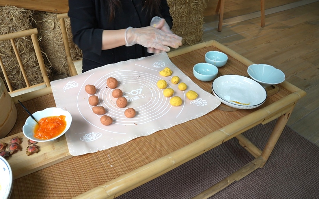 9.黄色面团揉成15克一个的圆球,橘色面团揉成25克一个的圆球;