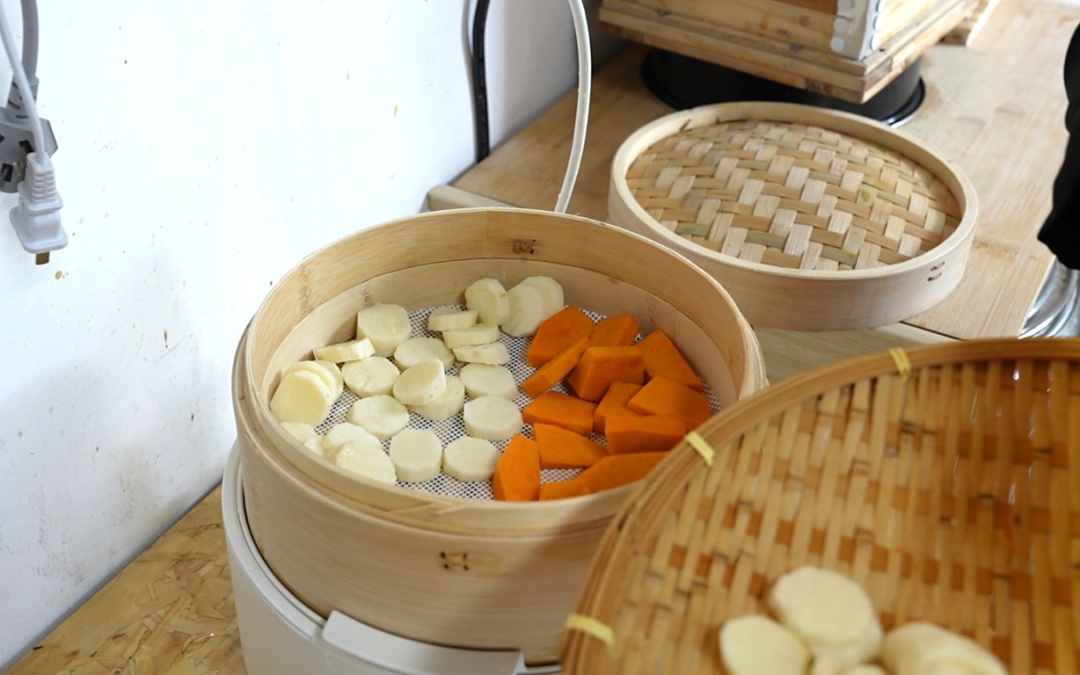 2.将切好的南瓜、山药上锅蒸15分钟;