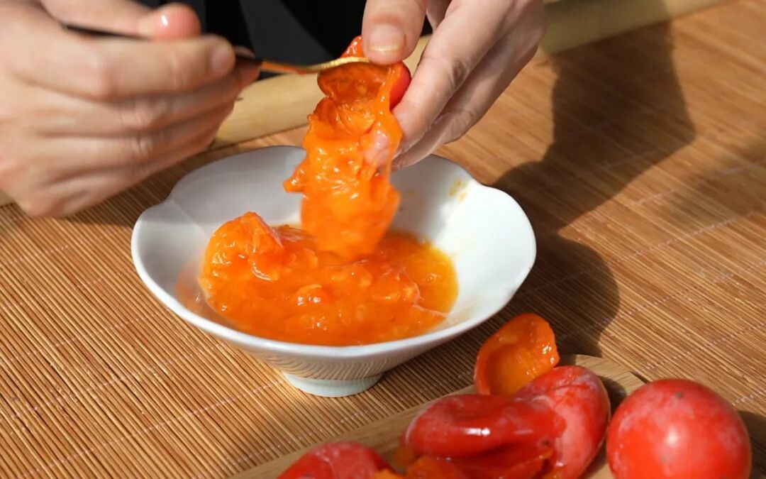 4.柿子果肉剥出,放置一旁备用;