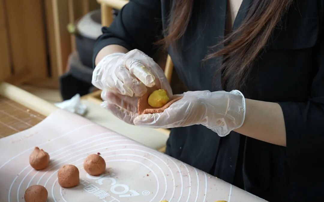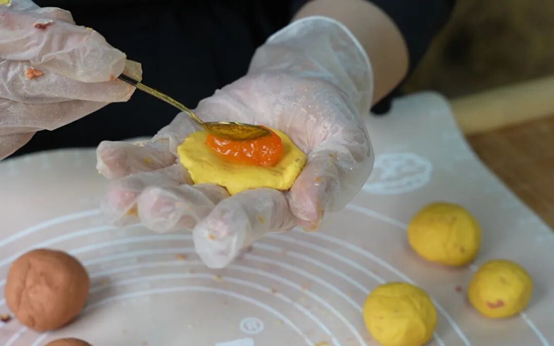 10.黄色面团压成饼状,包裹上柿子果肉,收口后捏紧;