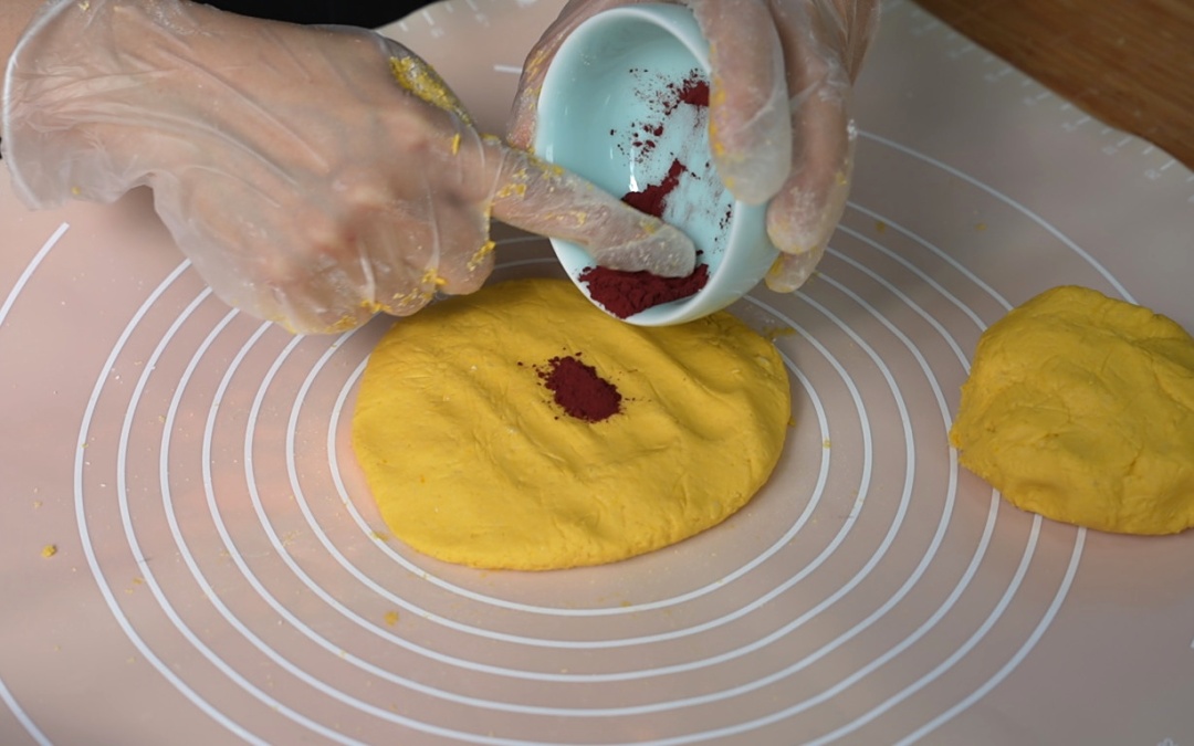 8.其中一份加入可食用红色色素,揉拌均匀;