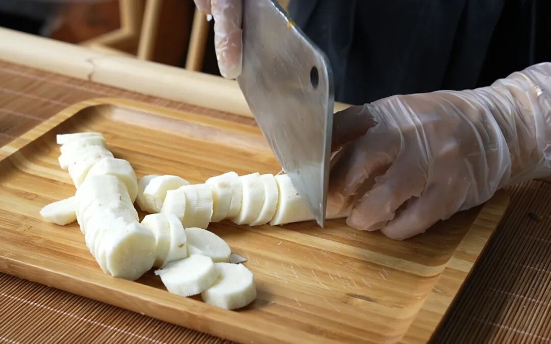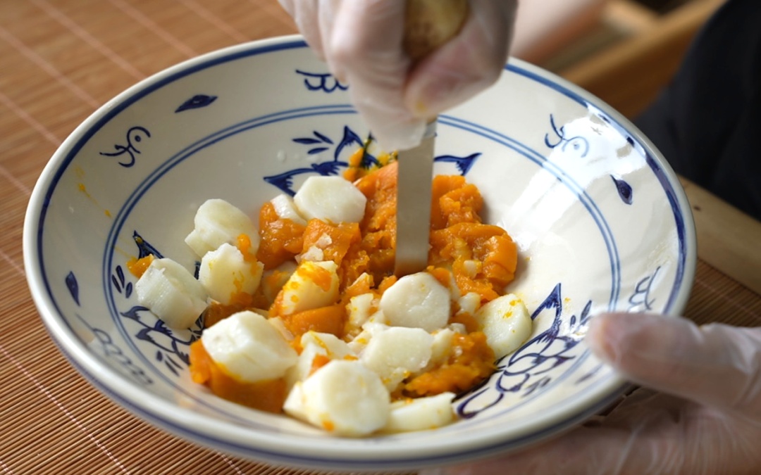 5.把蒸熟的南瓜和山药捣成泥状;