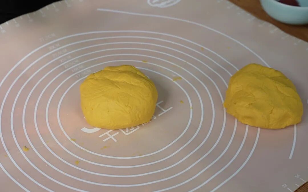 7.搅拌均匀,并把山药南瓜面团分成两份;