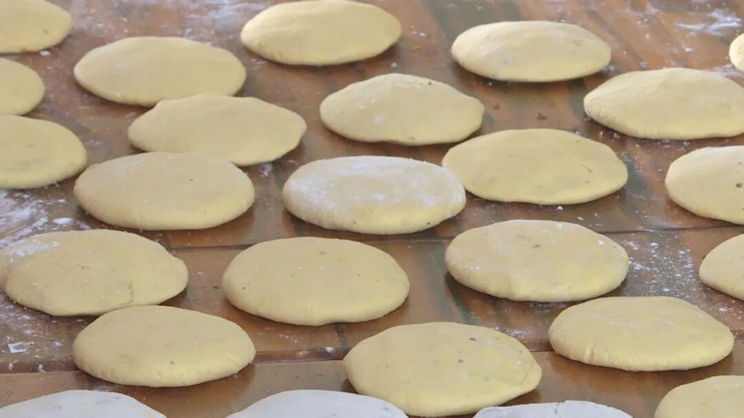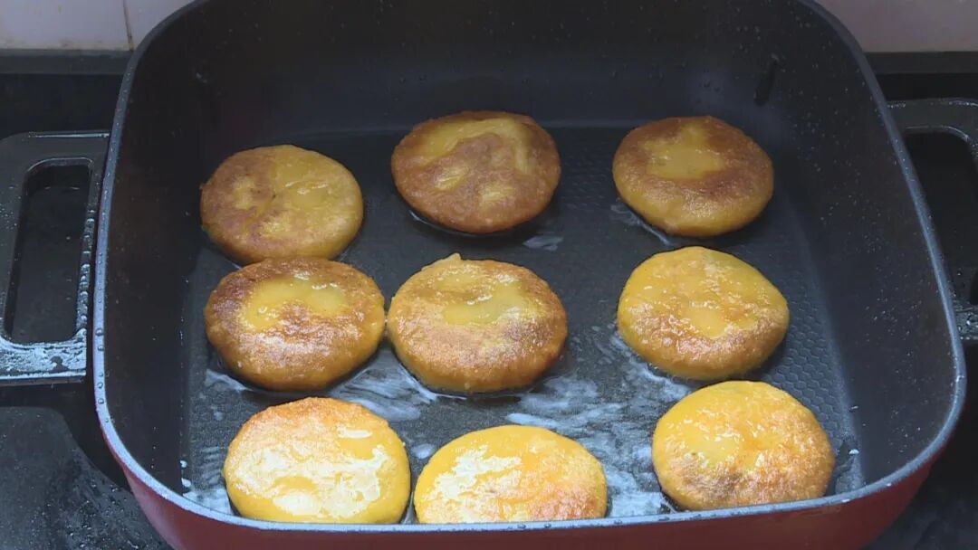 制作过程中,只见村民们手法娴熟:将融合了柿子果肉的面团捏成小碗状,填入清甜的豆沙馅,收口、搓圆、轻轻压扁,便可入锅小火慢煎。不一会儿,塌饼便煎至两面金黄,热气腾腾地出锅。金黄的脆皮包裹着软糯的内馅,一口咬下,柿子的清甜与豆沙的绵密交织口中,风味独特,颇受年轻一代的青睐。