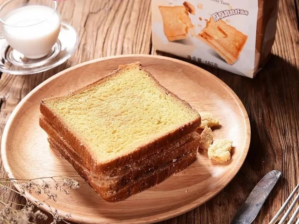 除了法棍,静安面包房的白脱别司忌也很受欢迎。白脱别司忌由面包片制成,涂上黄油和糖,烘烤得干硬脆香,渗出甜蜜蜜的糖油霜,口感介于面包和饼干之间,看起来平平无奇,咬一口酥酥脆脆。